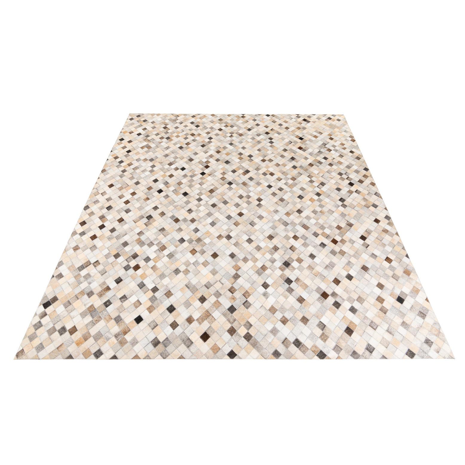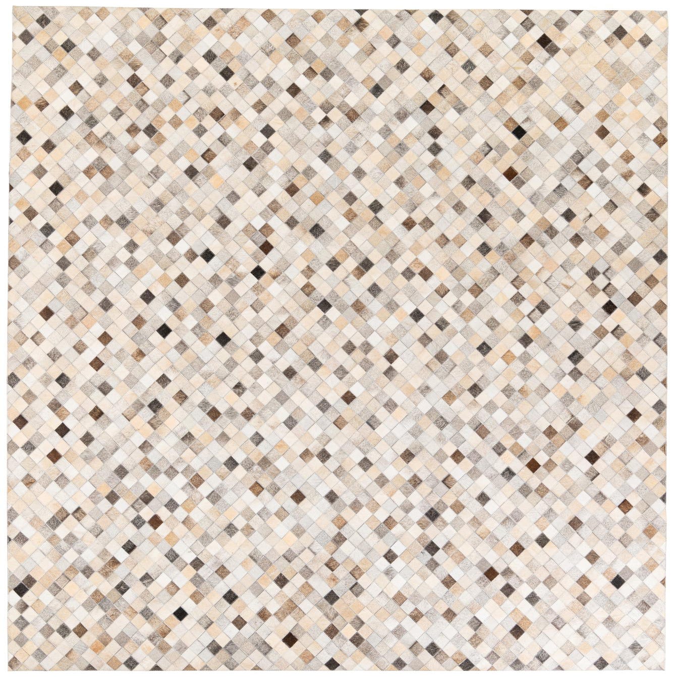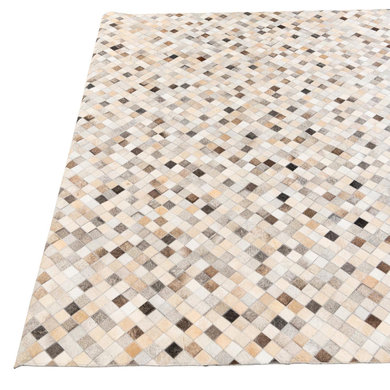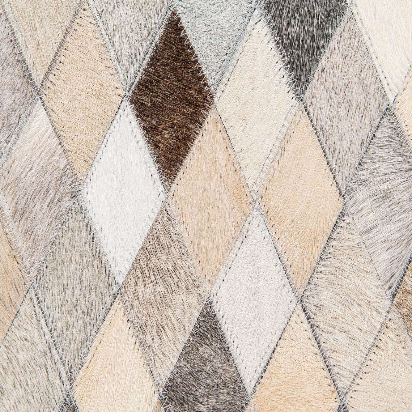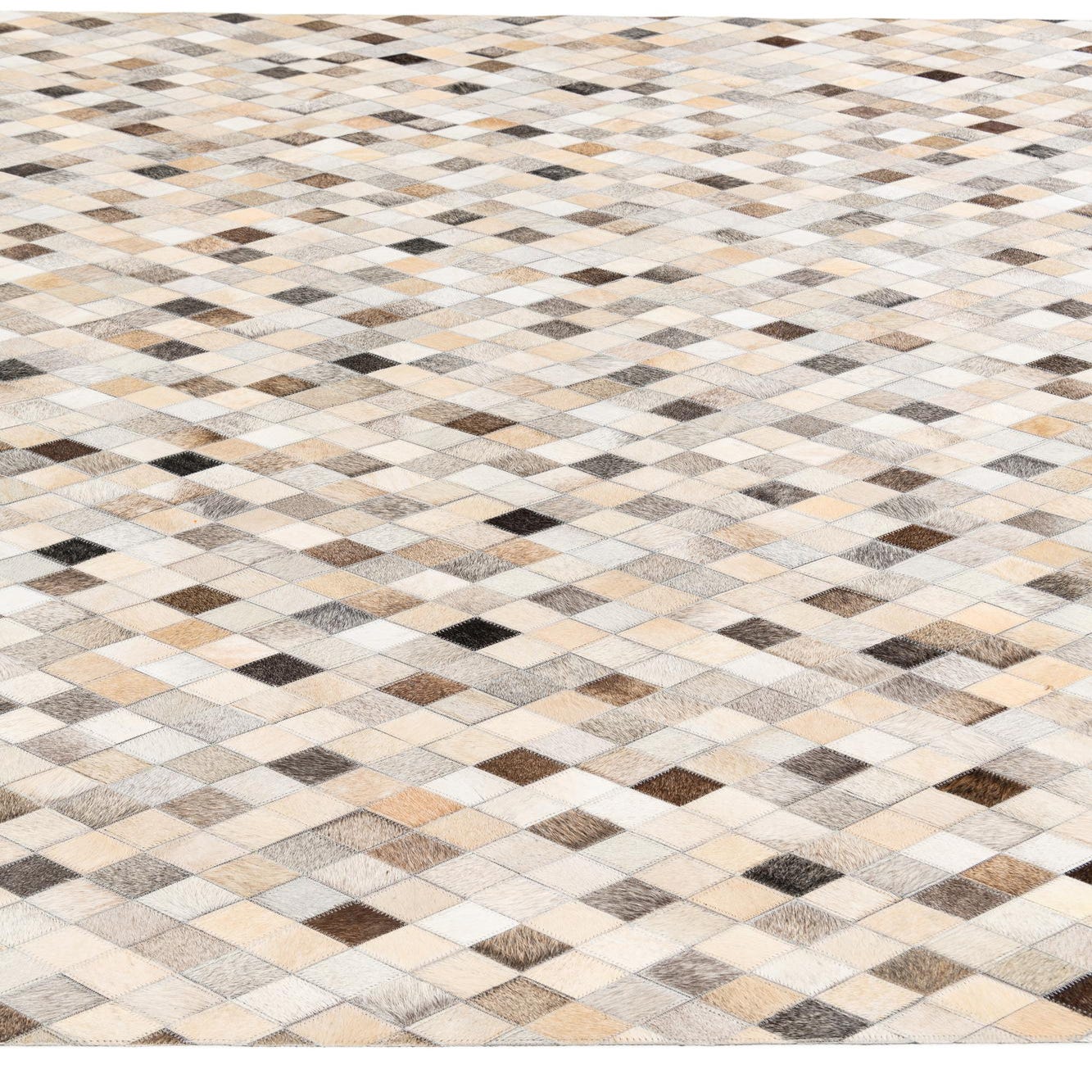 A 7x10 rectangular modern cowhide rug featuring a multi-colored diamond pattern in various shades of brown, beige, and cream.