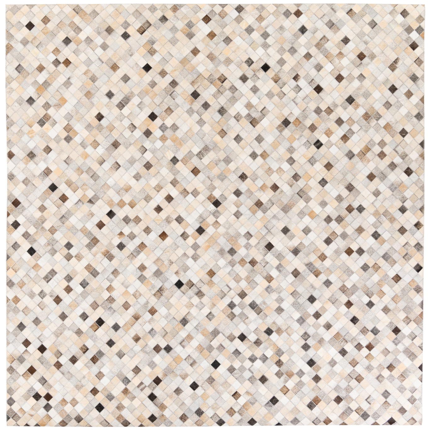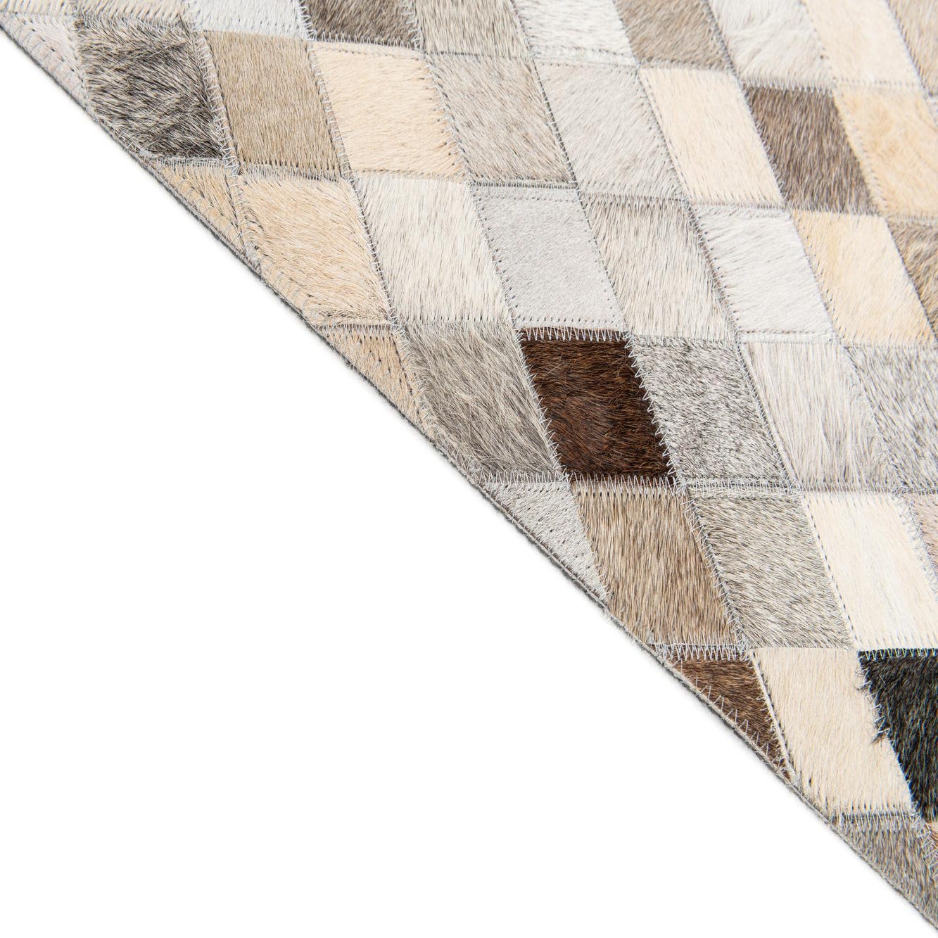 A 7x10 rectangular Cowhide Stocks rug featuring a modern diamond pattern in multi-colored natural cowhide and leather.