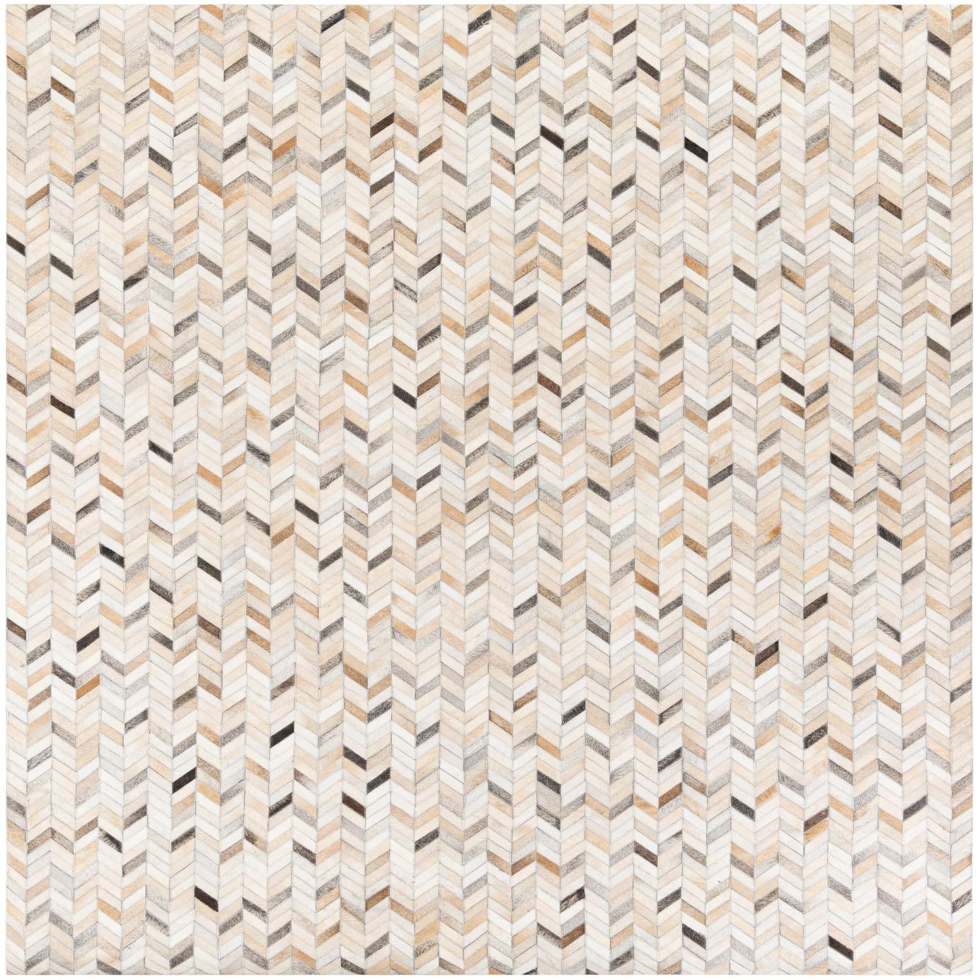 A tightly arranged chevron pattern made from small, hand-stitched hide tiles gives this rug a refined geometric look. The background is multi, composed of blended tones of beige, ivory, tan, brown and occasional black accents that create subtle contrast and visual depth. The repeating V-shaped rows draw the eye lengthwise, offering a clean, modern rhythm that still feels organic thanks to the natural variation in each hide piece.