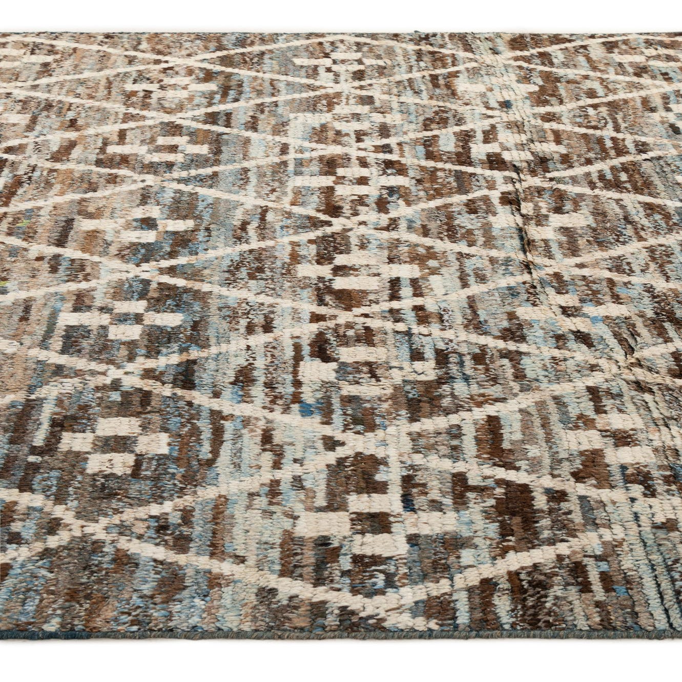 A 7x10 rectangular Darya rug with a modern multi-colored diamond pattern in shades of brown, beige, and blue.