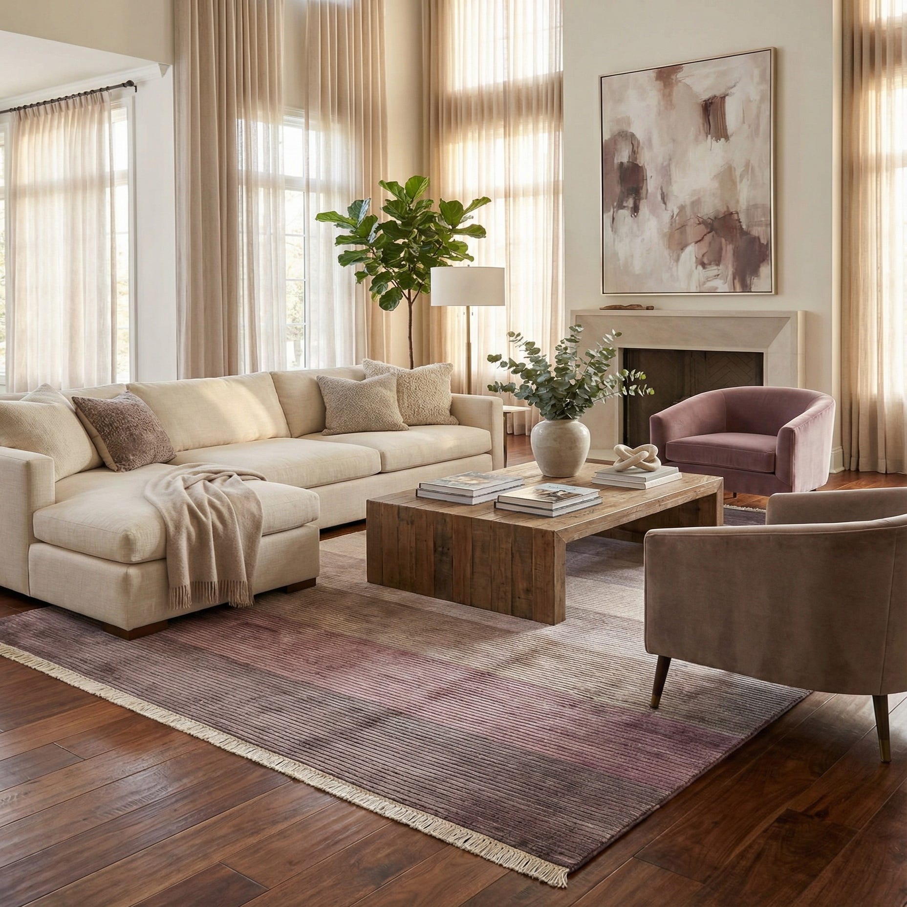 This rug fits well in contemporary and transitional interiors where muted color and texture are key. Place it under a sofa and coffee table to anchor a living room with warm wood furniture and neutral upholstery, or layer it in a bedroom to add a calm, tonal backdrop for soft linens and brushed-metal accents. It also complements Scandinavian and mid-century modern schemes, pairing nicely with pale woods, matte black fixtures, and accents in dusty mauve or warm taupe.