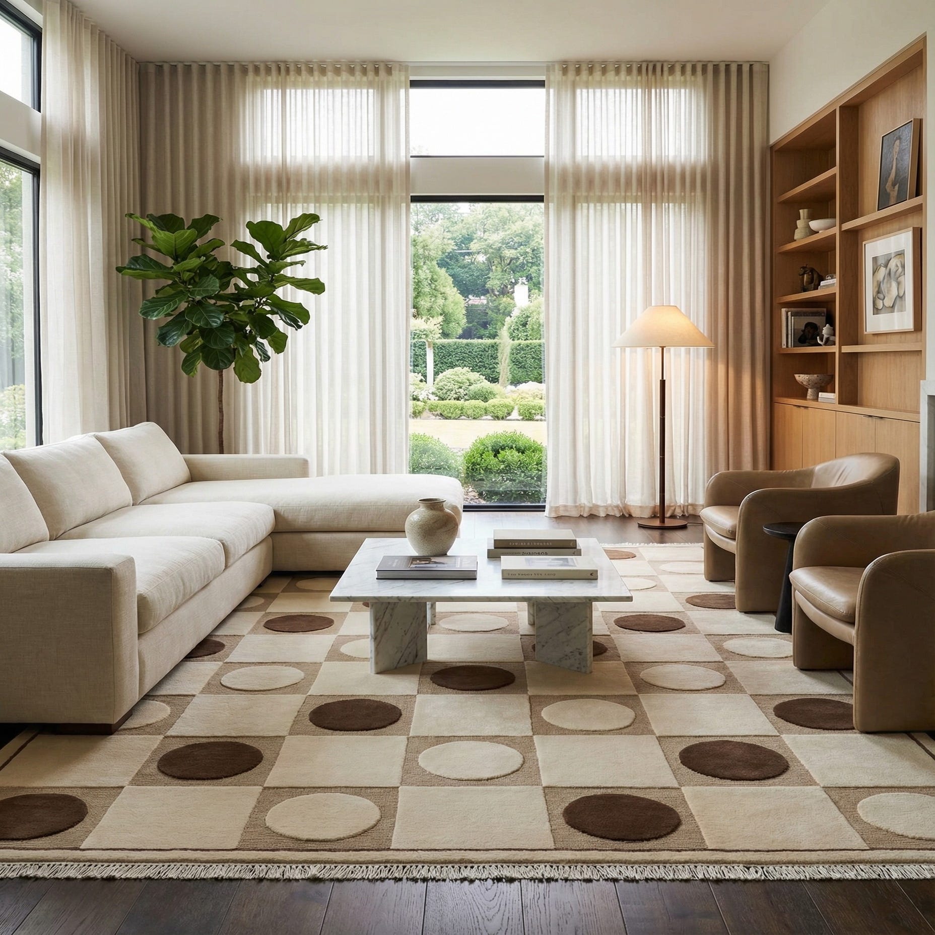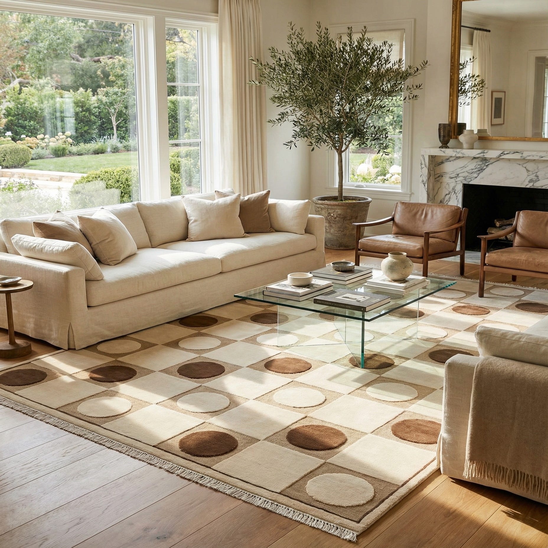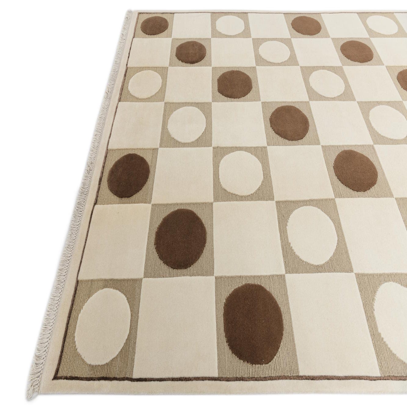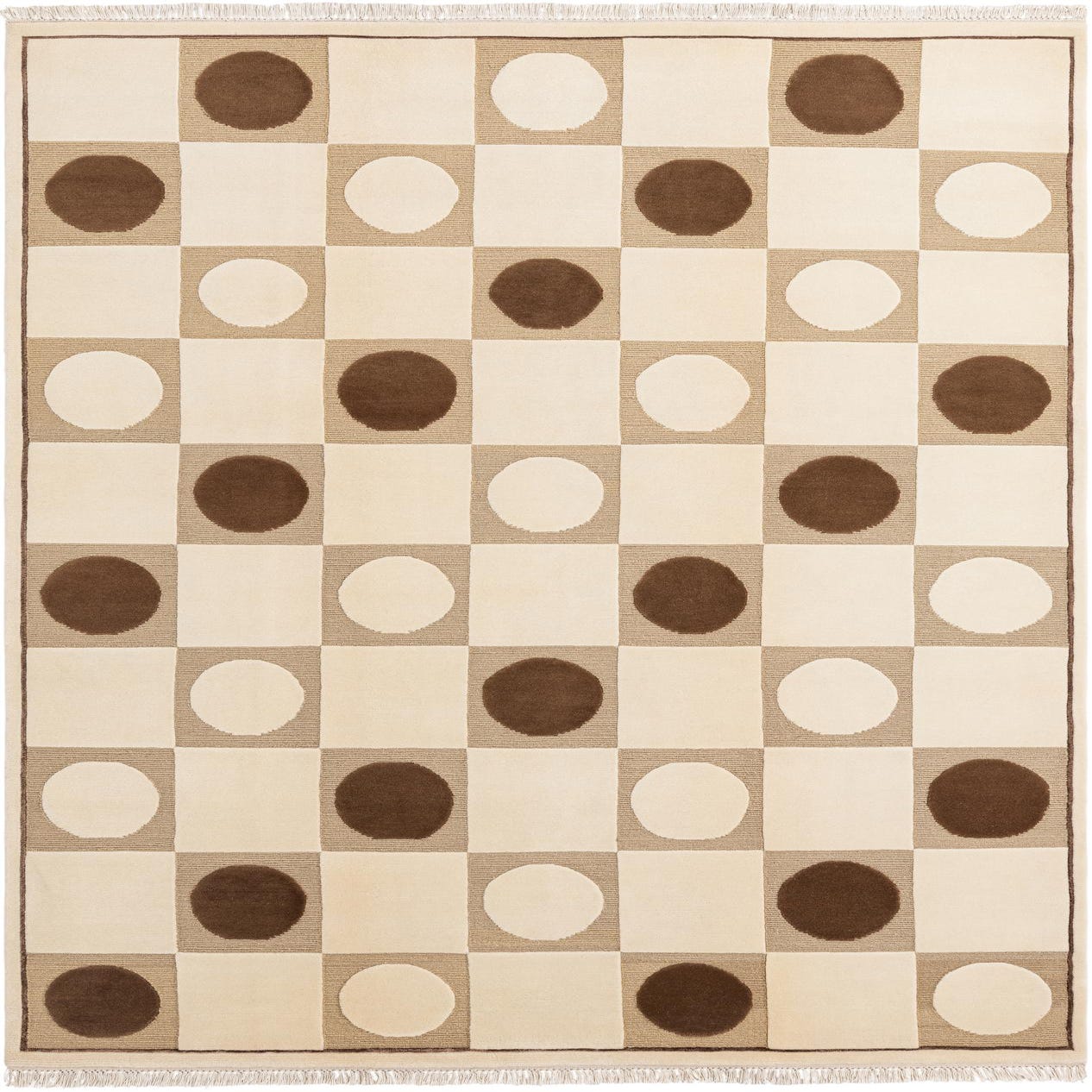 A 7x10 rectangular Darya rug featuring a modern Oriental design with a checkerboard pattern of brown and cream squares, some containing contrasting circles.