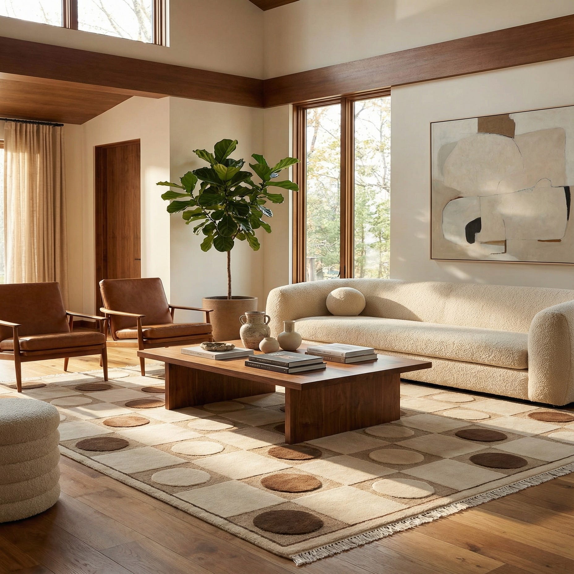 The Darya Collection offers a 7x10 hand-knotted rug crafted from 100% wool, showcasing a compelling checkerboard pattern that carries a modern aesthetic. The design features an alternating arrangement of beige and cream squares, each square accented with a centralized circle motif in hues of brown, light brown, and tan, set against a multi-shade background that seamlessly blends these neutral tones. The texture of the wool offers a soft, tactile experience underfoot, further complemented by the subtle fringe detailing along the edges.