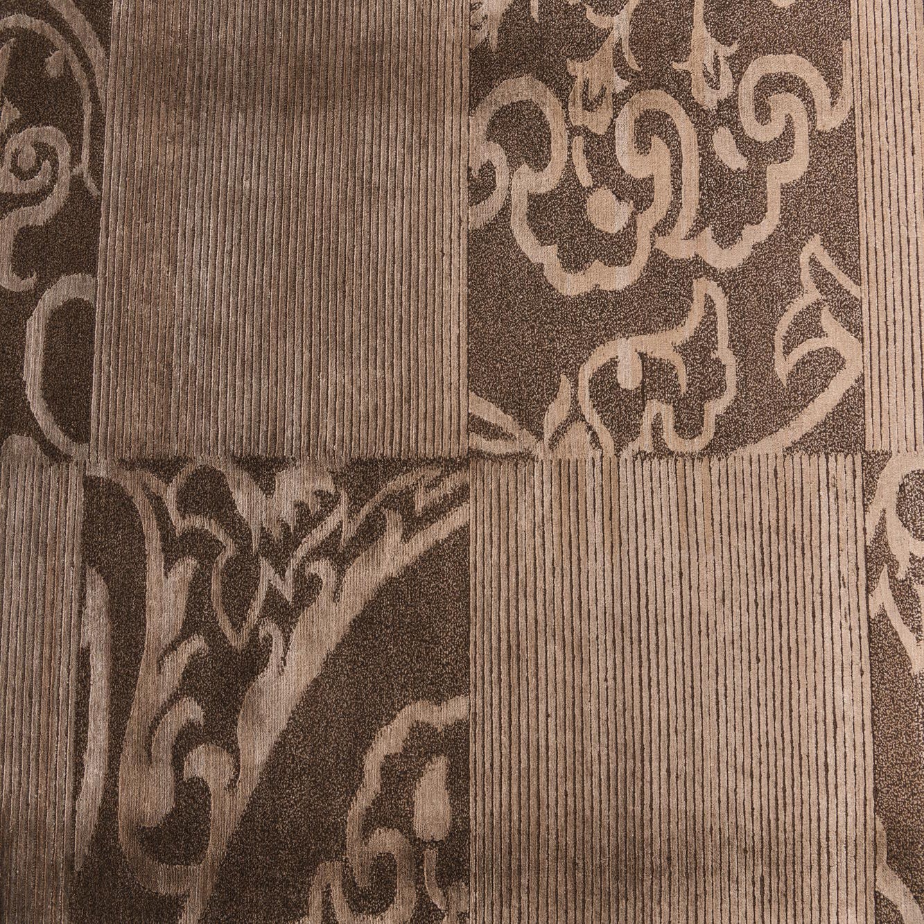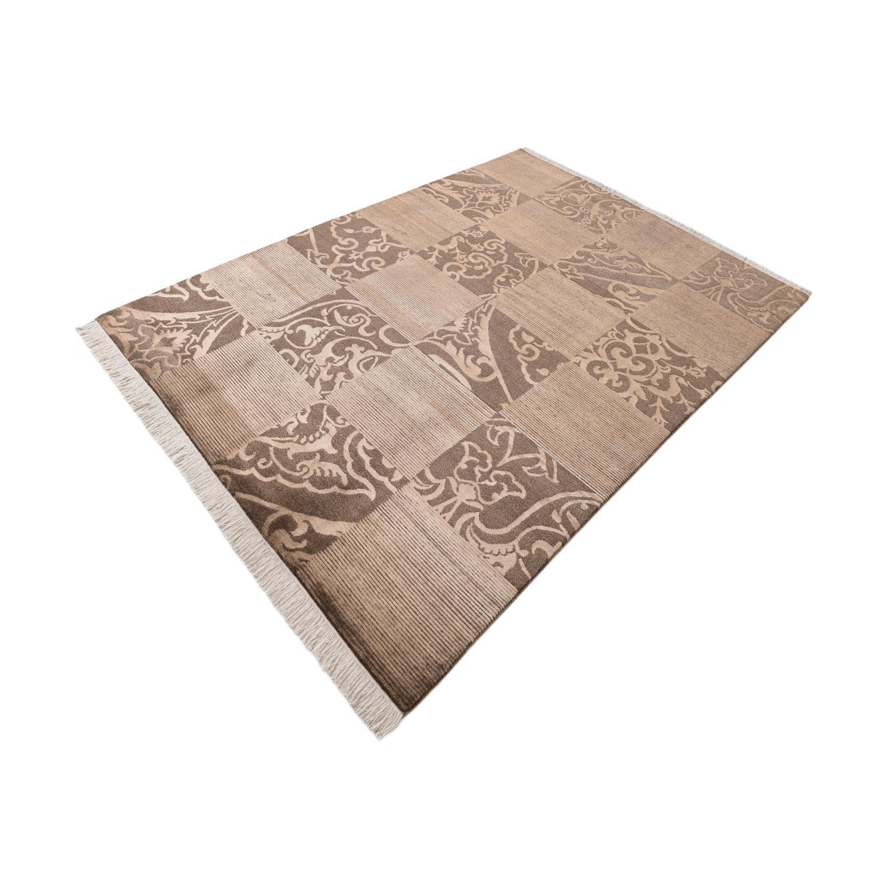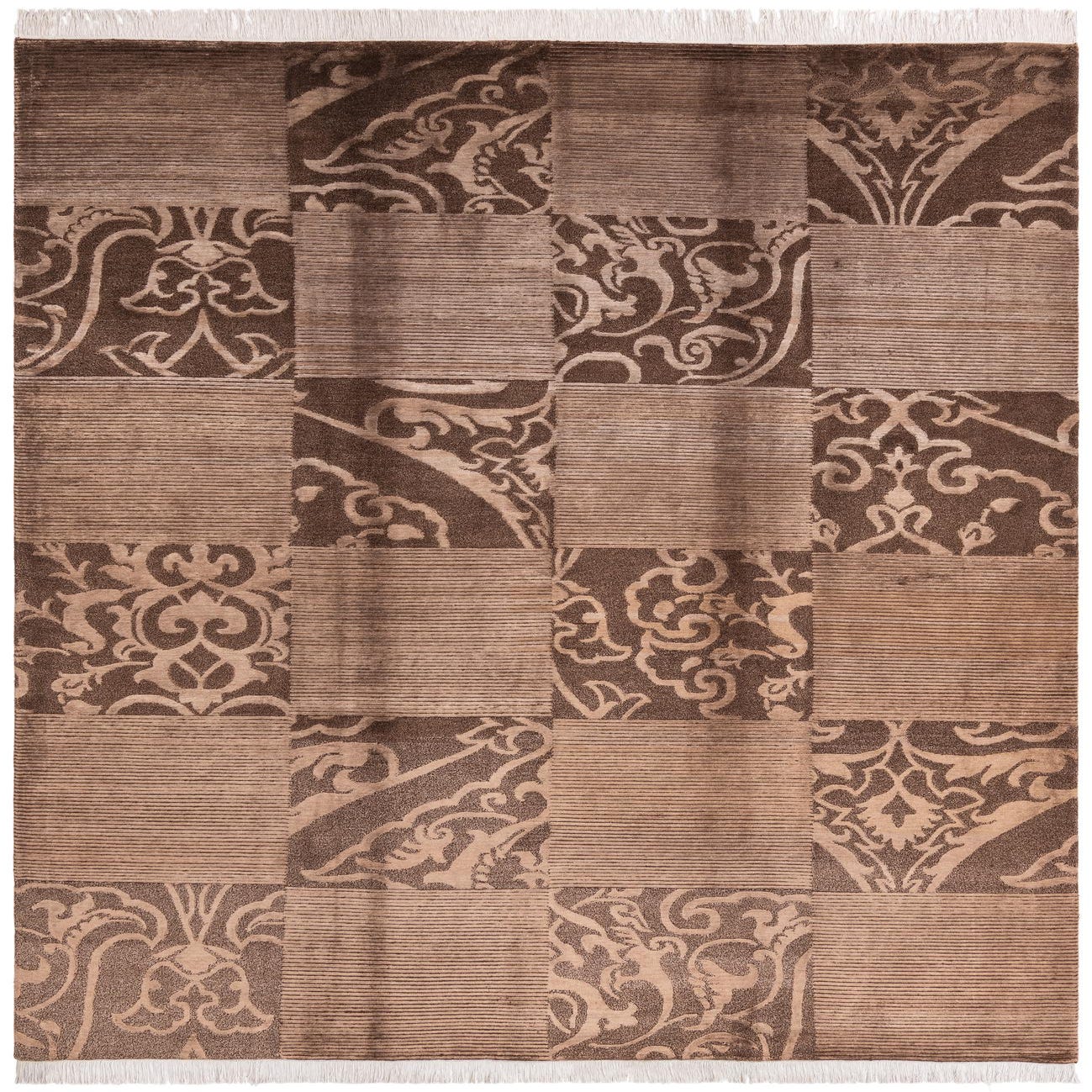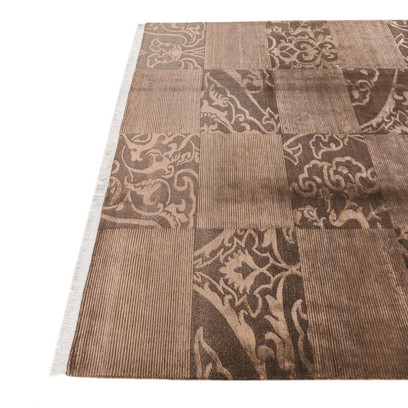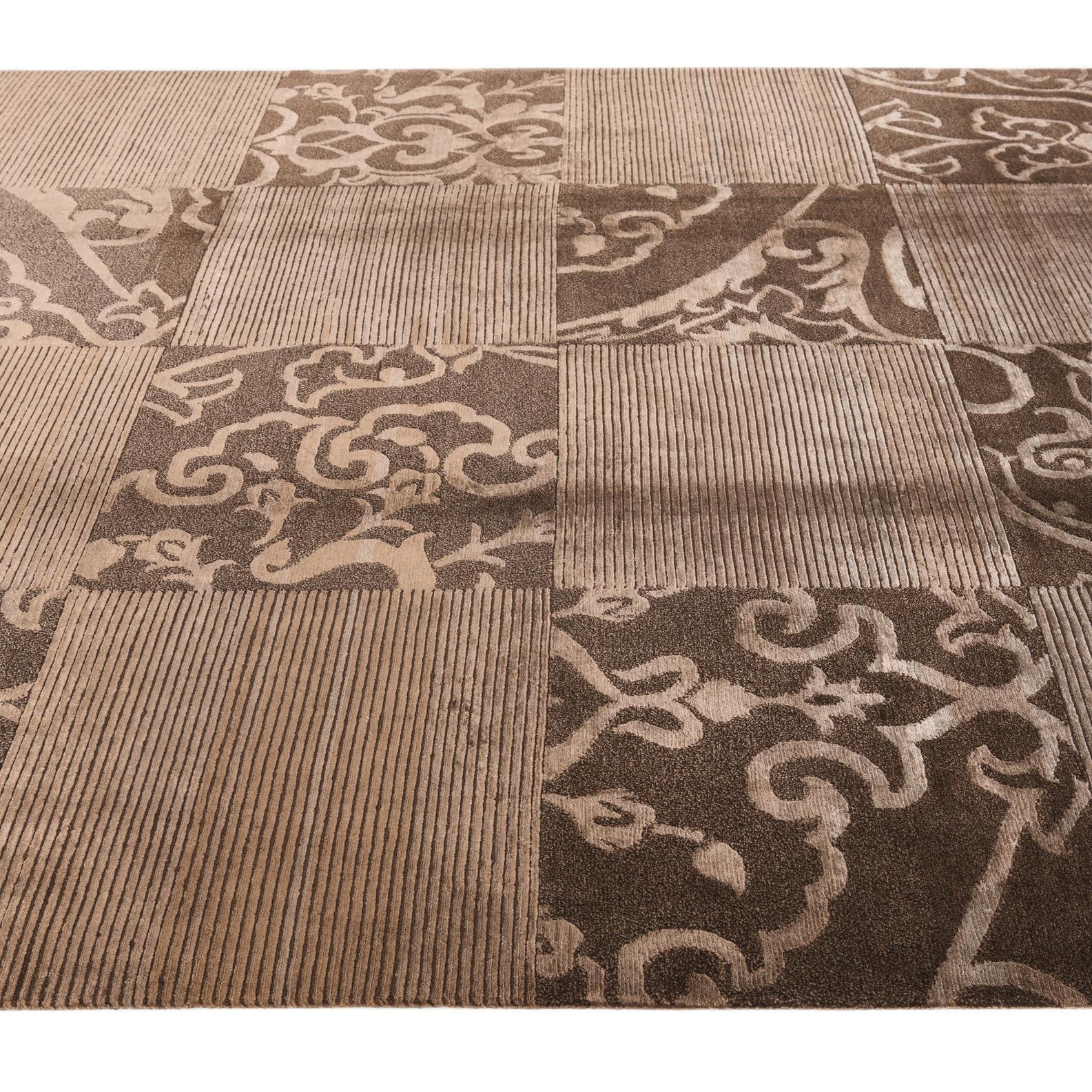 A 7x10 rectangular Darya rug with a modern oriental patchwork design in shades of brown and beige, featuring both striped and ornate floral patterns.
