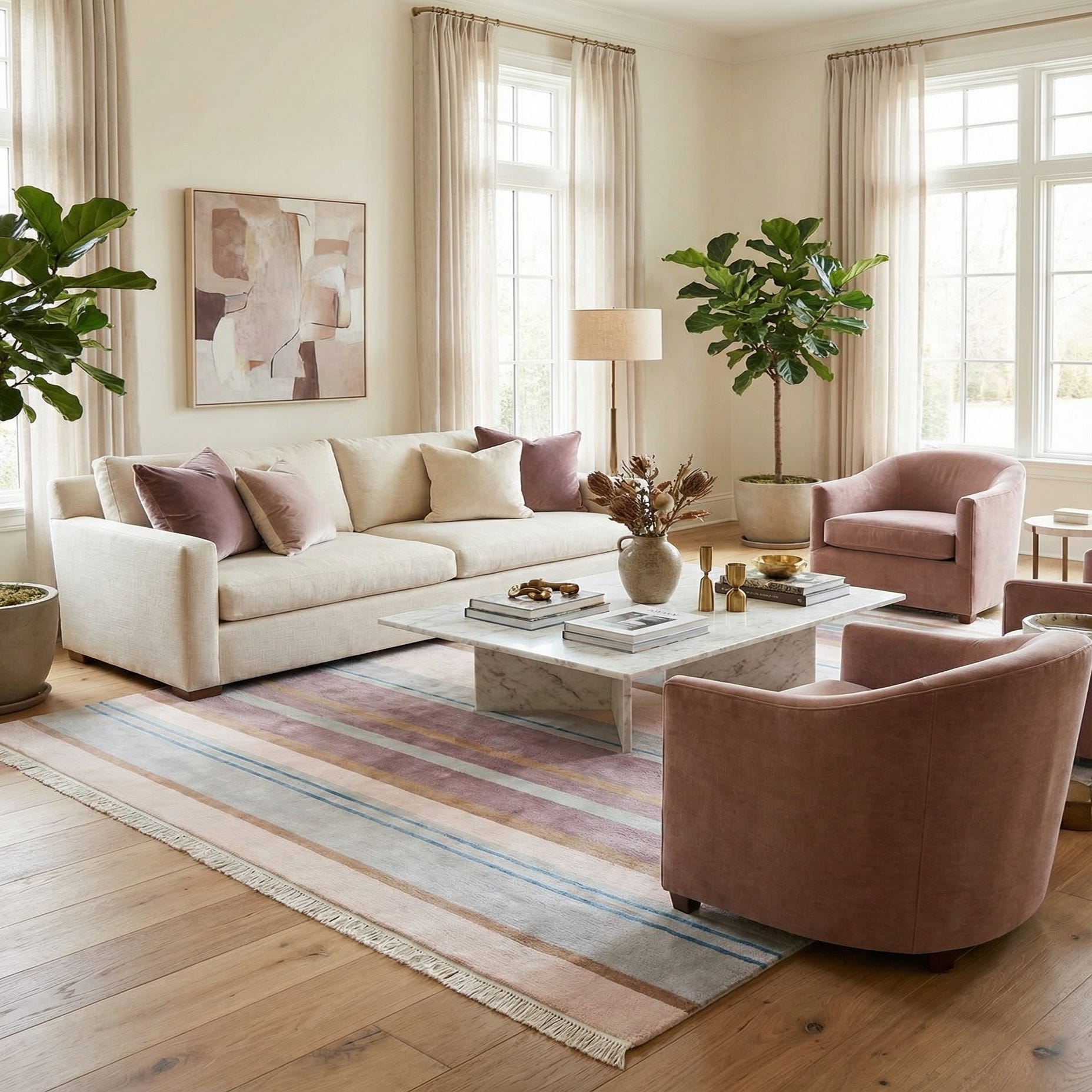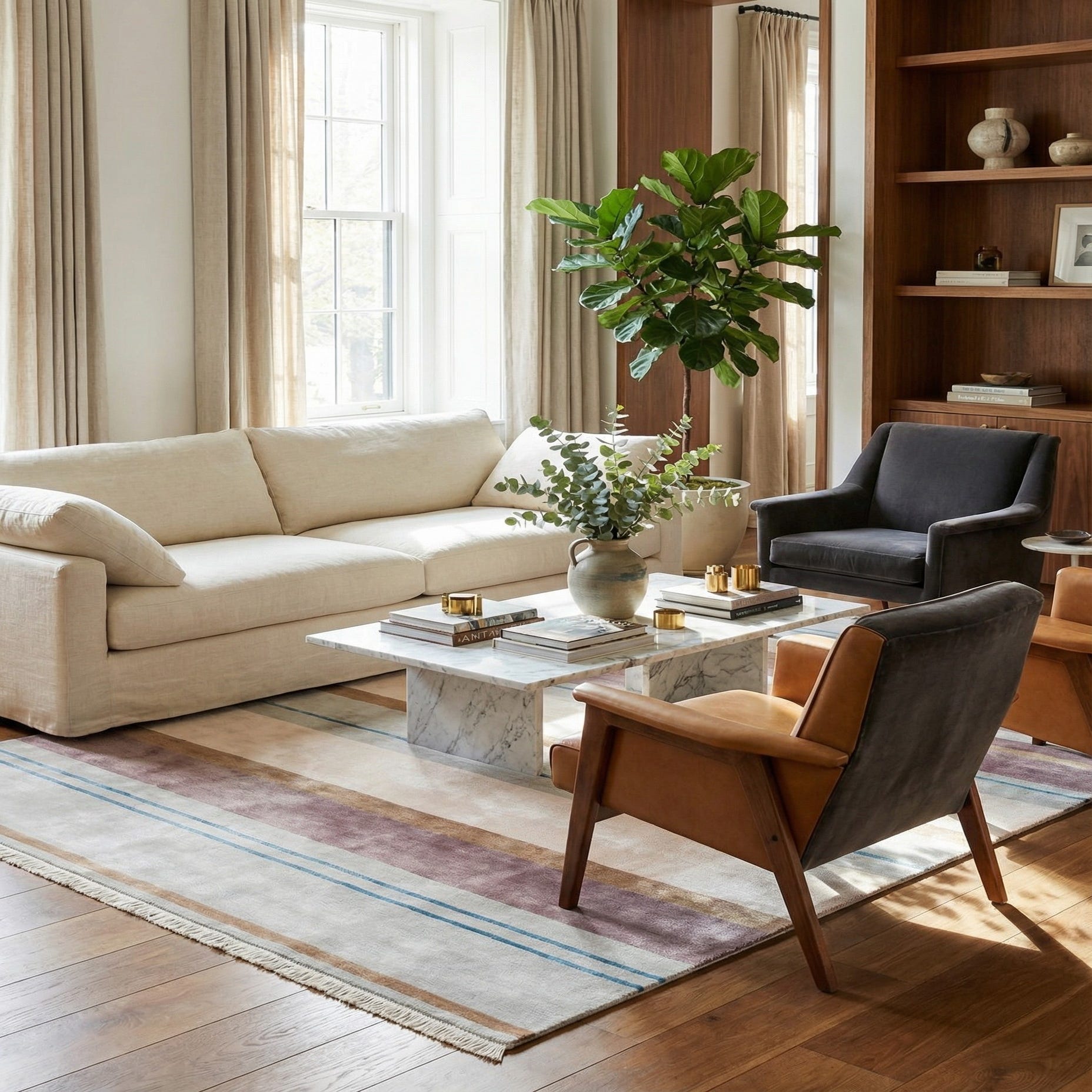 This rug pairs easily with relaxed, layered interiors — a neutral linen sofa and warm wood furniture for a contemporary living room, a light-toned bedroom where the softer blues and ivories enhance a serene mood, or a transitional dining space anchored by simple chairs and brass or matte metal accents. It also fits coastal, Scandinavian, or modern farmhouse schemes where clean lines and muted color plays are key, and works well under a coffee table or layered with a smaller textured rug for added interest.