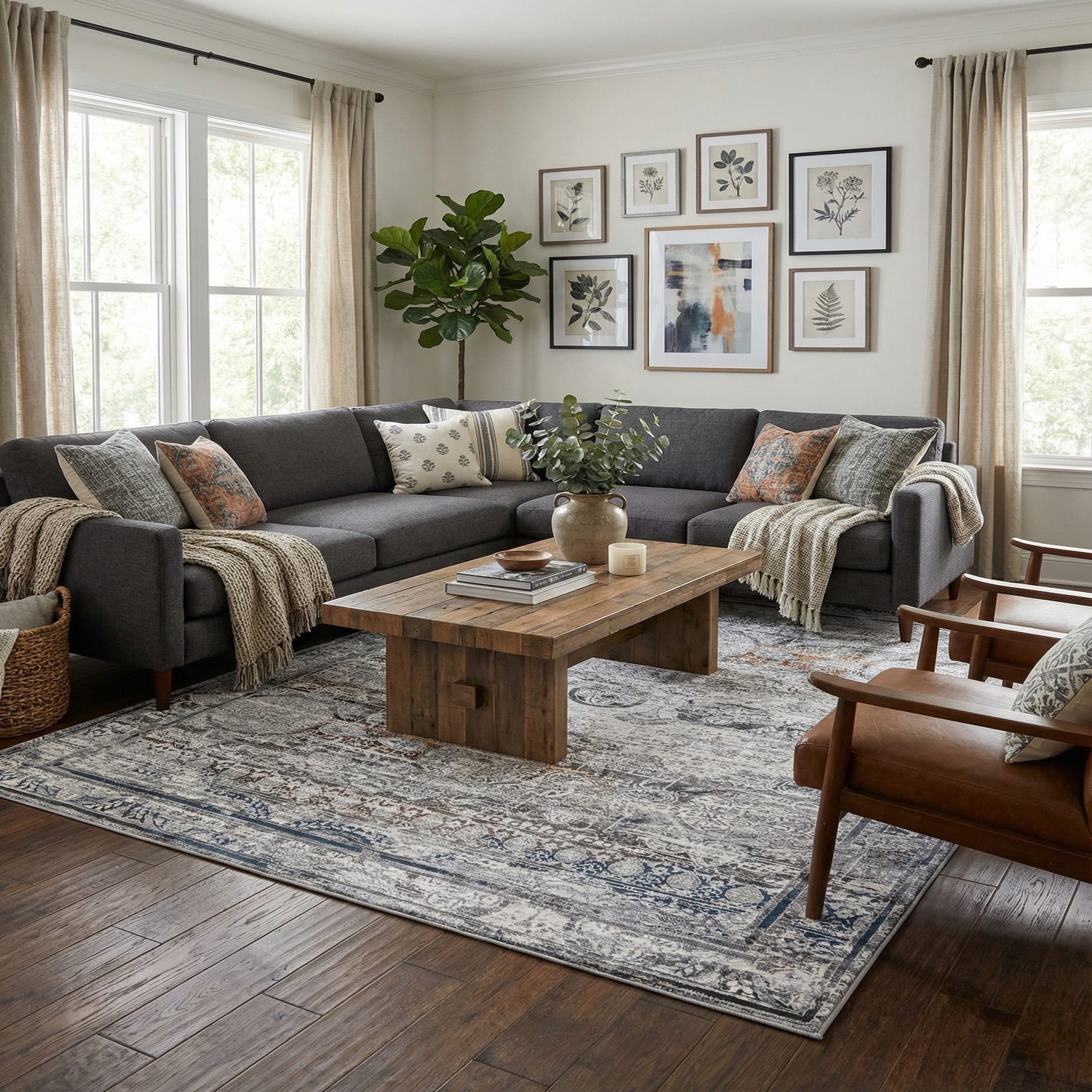 Made from 60% polypropylene and 40% polyester, the rug has a low, dense pile that feels smooth underfoot and holds a subtle sheen from the polyester fibers. The surface has just enough texture to catch light and complement wood or tile floors without adding bulk. It works well as an anchor in a transitional living room, layered beneath a coffee table in a neutral seating area, or placed in a dining space to balance warm wood tones. The varied blues and olives pair easily with cool-gray interiors, while the brown and orange accents bring warmth to rustic or farmhouse settings.