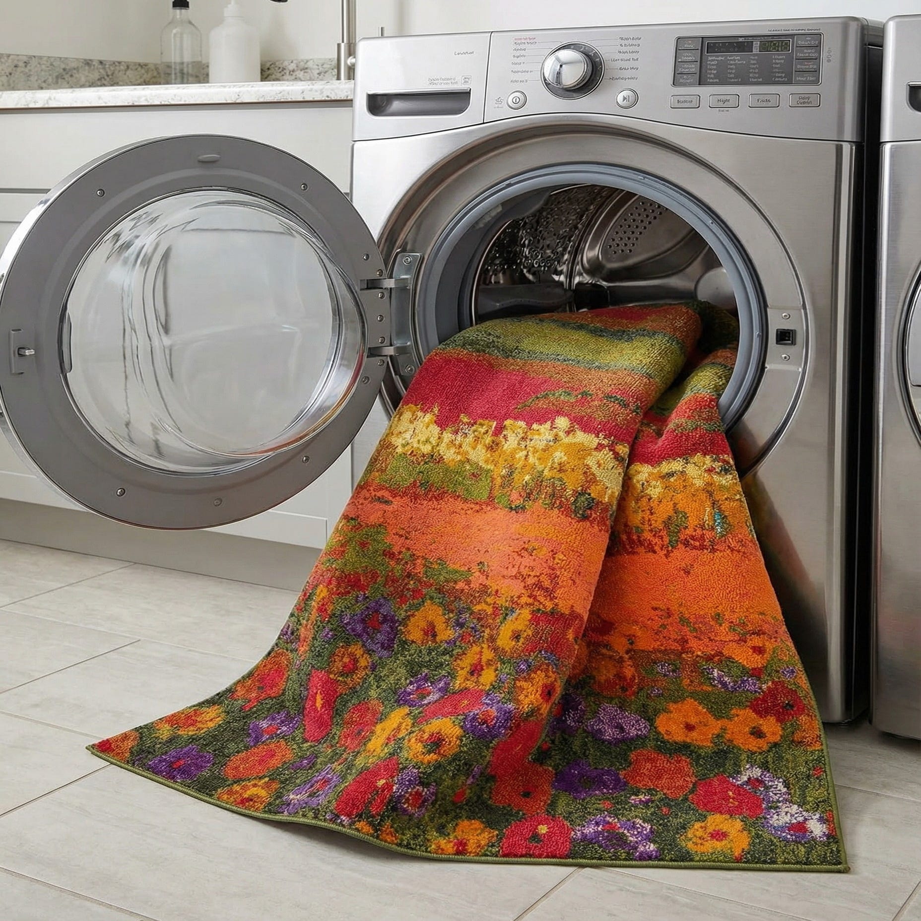 A 7x10 rectangular multi-colored rug featuring a modern botanical landscape with fields of flowers under a cloudy sky.
