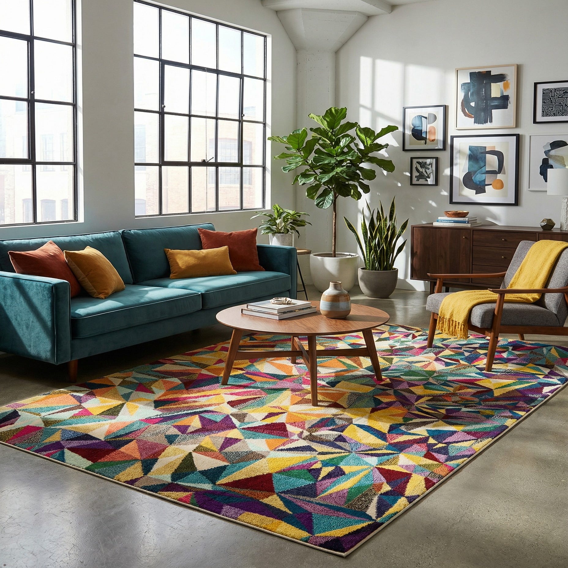 This rug brings personality to modern and eclectic interiors: use it to anchor a living room seating area beneath a coffee table, add a burst of color to a neutral bedroom, or brighten a playroom or family space. It also pairs nicely with mid-century and contemporary furnishings—contrast the busy pattern with solid, streamlined sofas or layer it over hardwood or concrete floors to introduce warmth and visual interest.