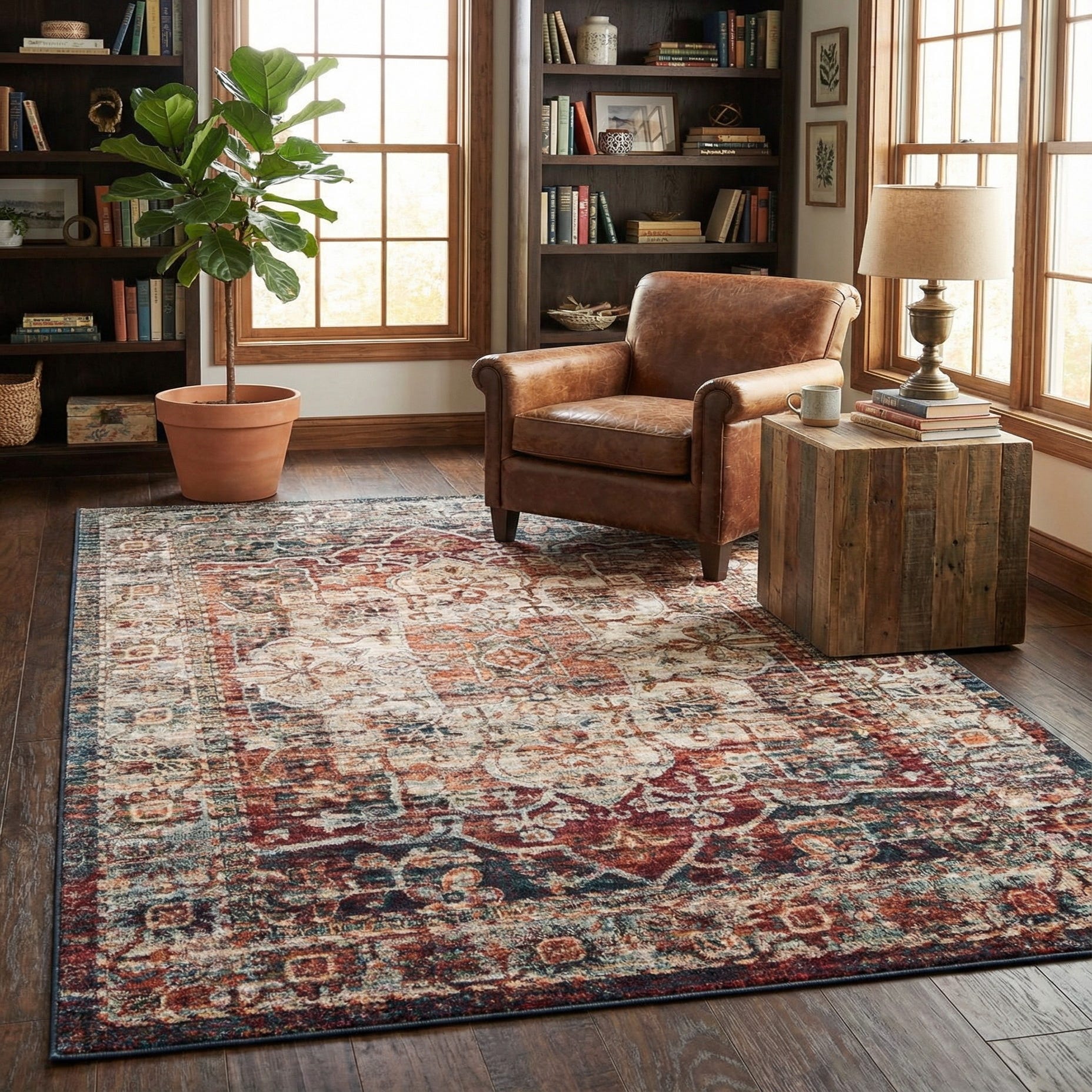 Place this rug to anchor a living room seating area or beneath a dining table for a grounded, lived-in feel. It pairs well with warm wood furniture and leather seating for a transitional or farmhouse scheme, and it also complements eclectic or bohemian interiors where layered color and texture are welcome. The palette and pattern provide enough visual interest to work as a focal point in an entry or bedroom without overwhelming existing furnishings.