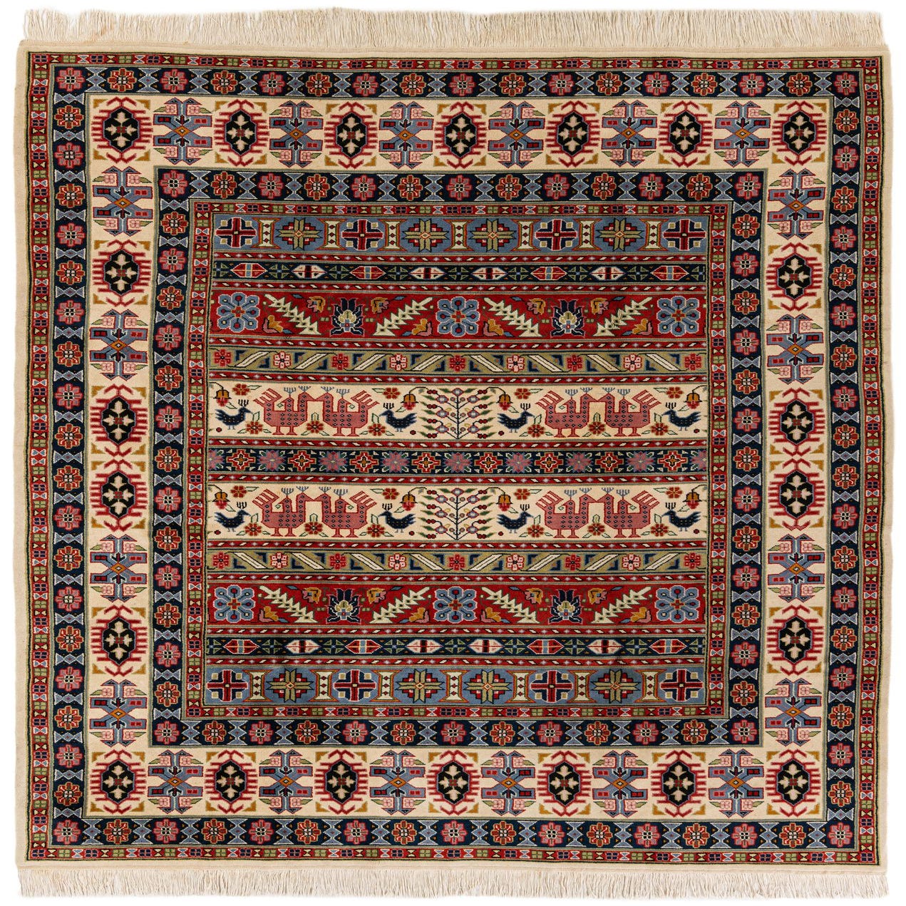 A 7x10 rectangular multi-colored traditional Oriental rug with intricate patterns and birds on a cream background.