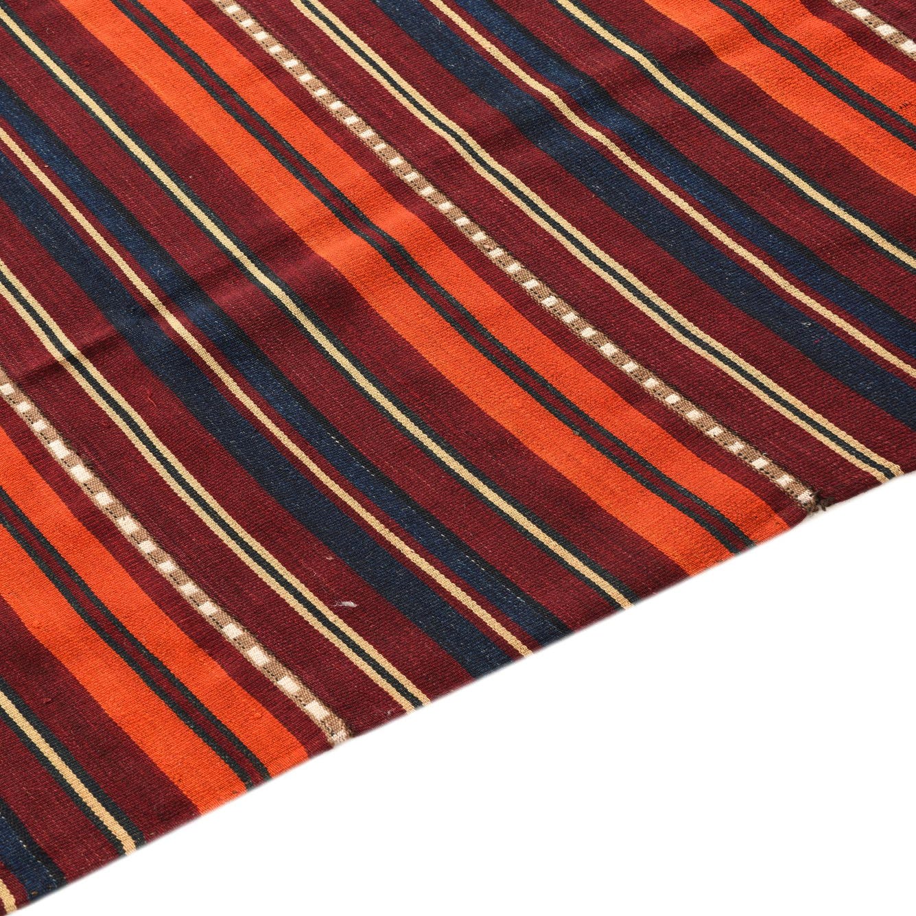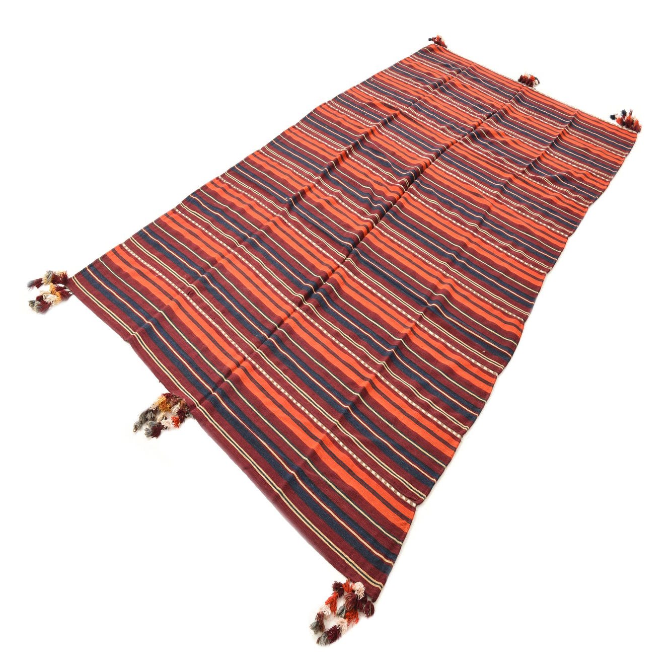 A 7x10 rectangular flatweave Kilim Fars rug with multi-colored stripes and decorative tassels.