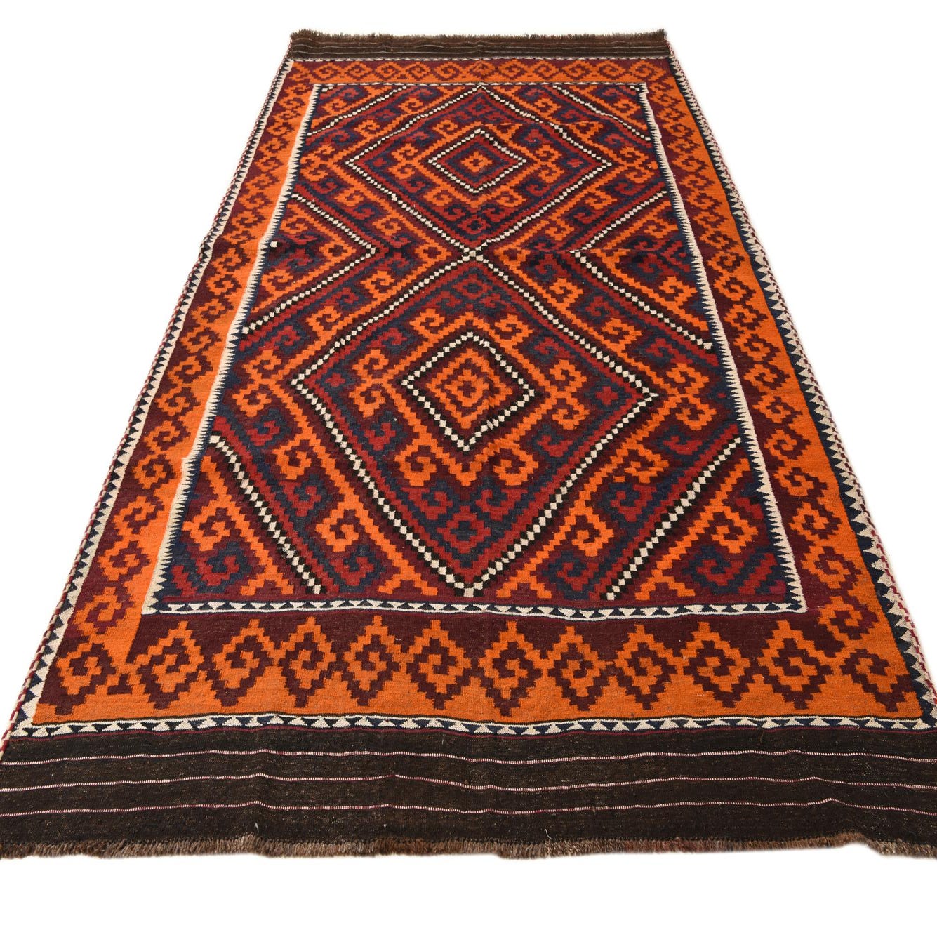A 7x10 rectangular Kilim Fars rug with a multi-colored Persian tribal pattern, featuring large central diamonds and an orange border, ideal for a living room.