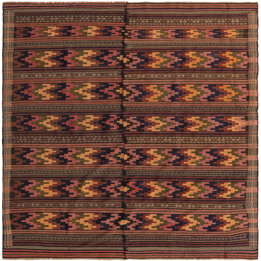 A 7x10 multi-colored rectangular Kilim Fars rug with tribal geometric patterns in shades of red, orange, green, and blue.