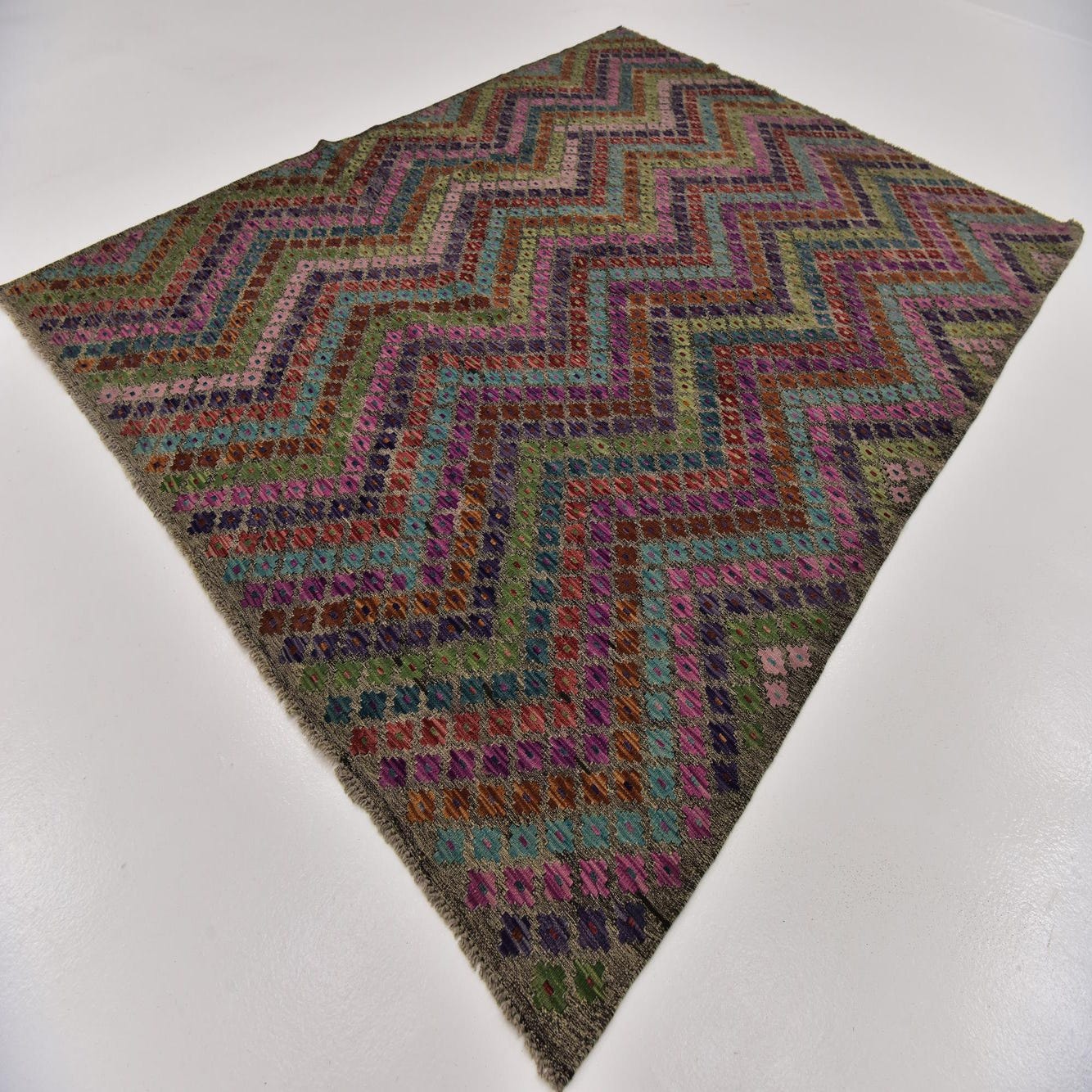 A 7x10 multi-colored rectangular Kilim Modern wool rug with a vibrant tribal zigzag pattern, perfect for a living room.