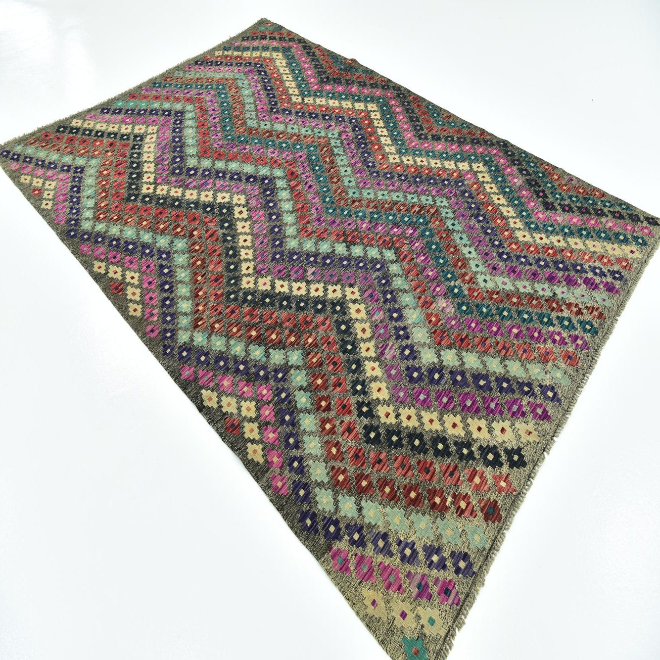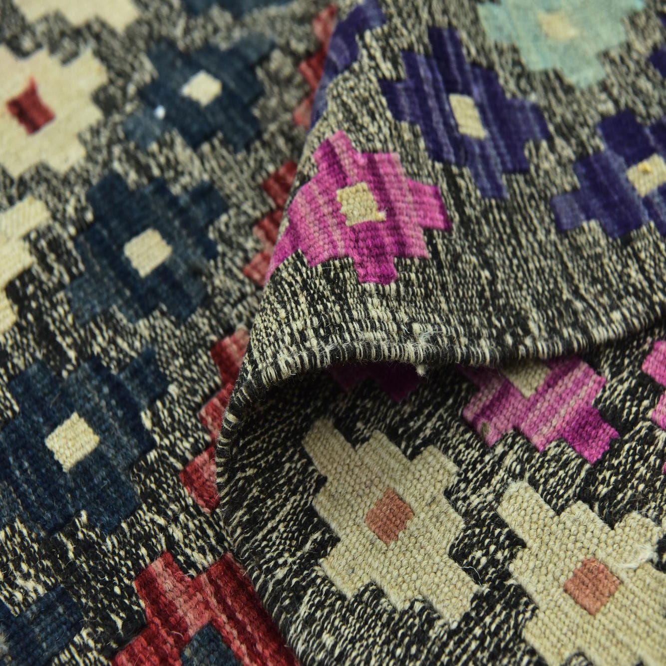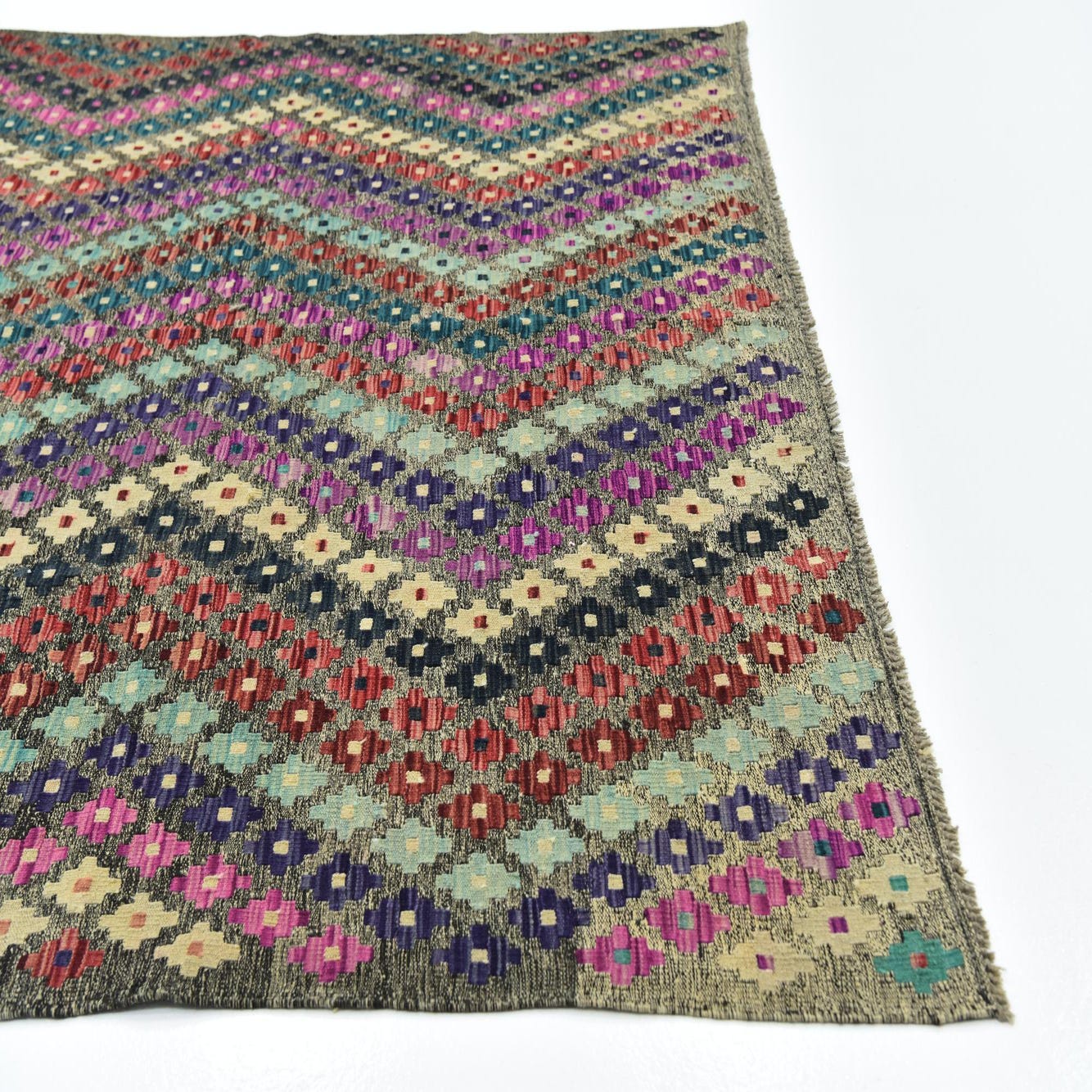 Hand-woven of 100% wool, the rug has a low, tight flatweave with a slightly textured, tactile surface you can feel underfoot; the wool gives the piece natural warmth and a lived-in character with visible handwoven detail. It works well layered in a casual living room or under a dining table to add pattern without bulk, and it brings color and structure to a home office or bedroom beside neutral furniture and wood finishes. Pair it with warm woods and simple mid-century or bohemian accents for a cohesive, layered look.