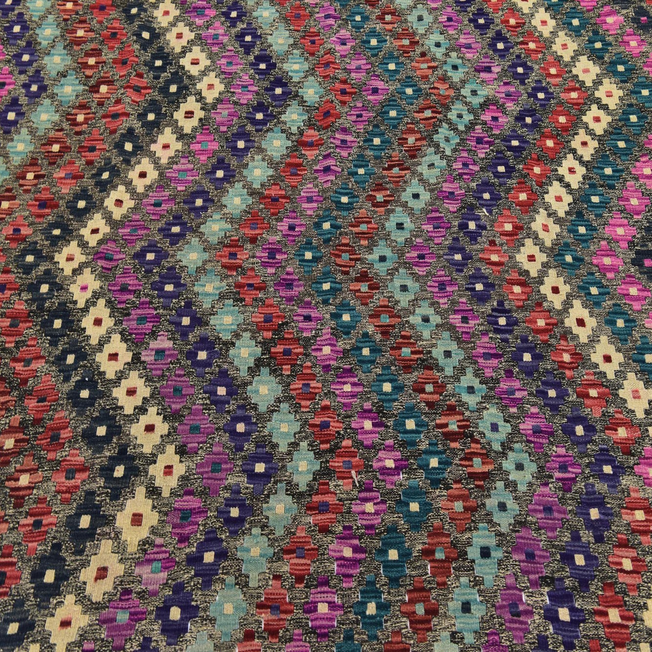 A compact, diagonal kilim motif creates a lively, rhythmic field across a multi-hued background. Tiny geometric medallions are arranged in slanted rows, alternating tones of beige, blue, brown, gray, green, purple and red to form chevron-like bands that draw the eye across the weave. The multi background is brightened by cream-beige accents while deeper blues, purples and browns anchor the design, producing a balanced mix of color and pattern that reads collected and intentional.