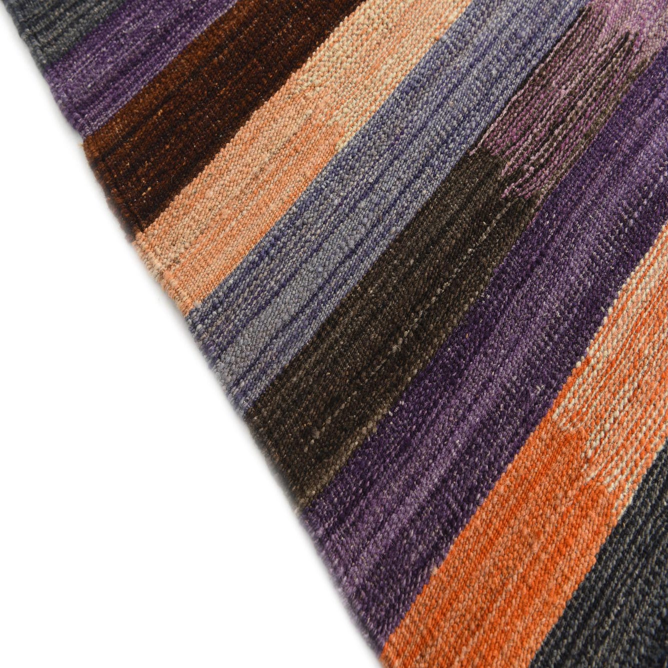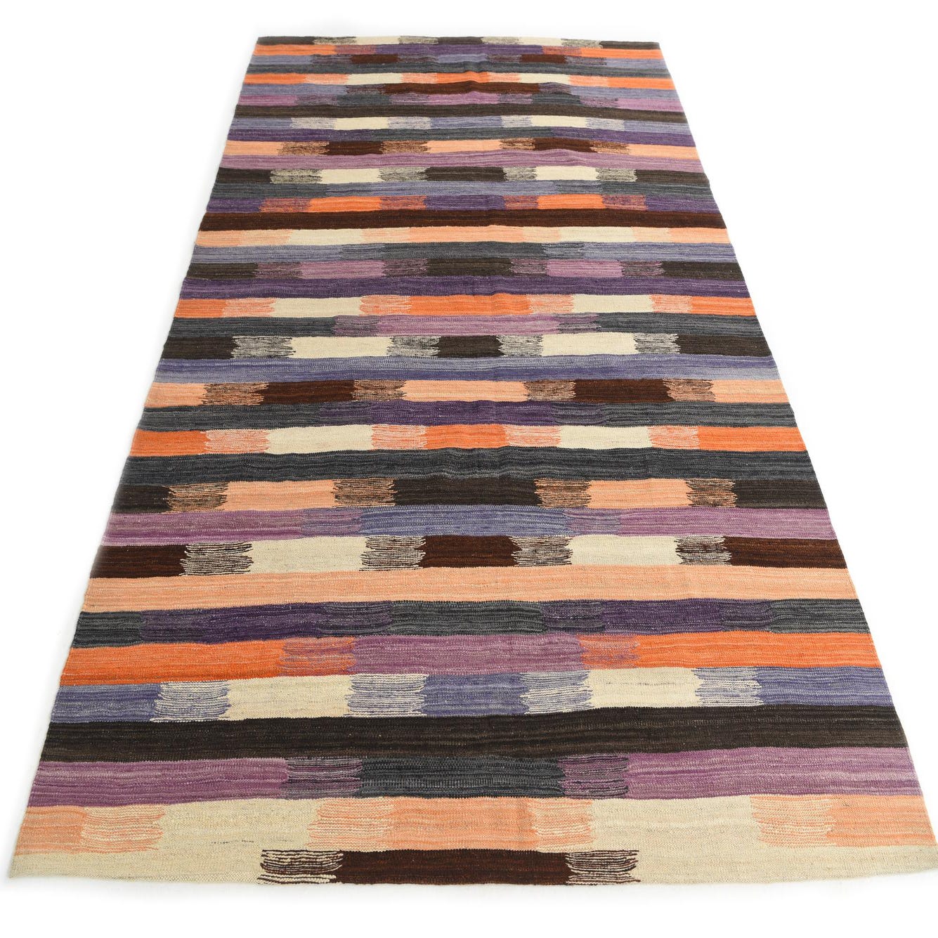 This hand-woven, 100% wool kilim displays a banded, horizontal stripe pattern punctuated by painterly, brushstroke-like blocks. The multi background carries warm oranges and peaches alongside deeper browns and black, while violet and purple tones add cool contrast and beige highlights provide visual rest. The flatwoven construction gives the surface a low-profile, tactile quality—firm underfoot with the natural texture of wool and clear, hand-crafted color transitions.