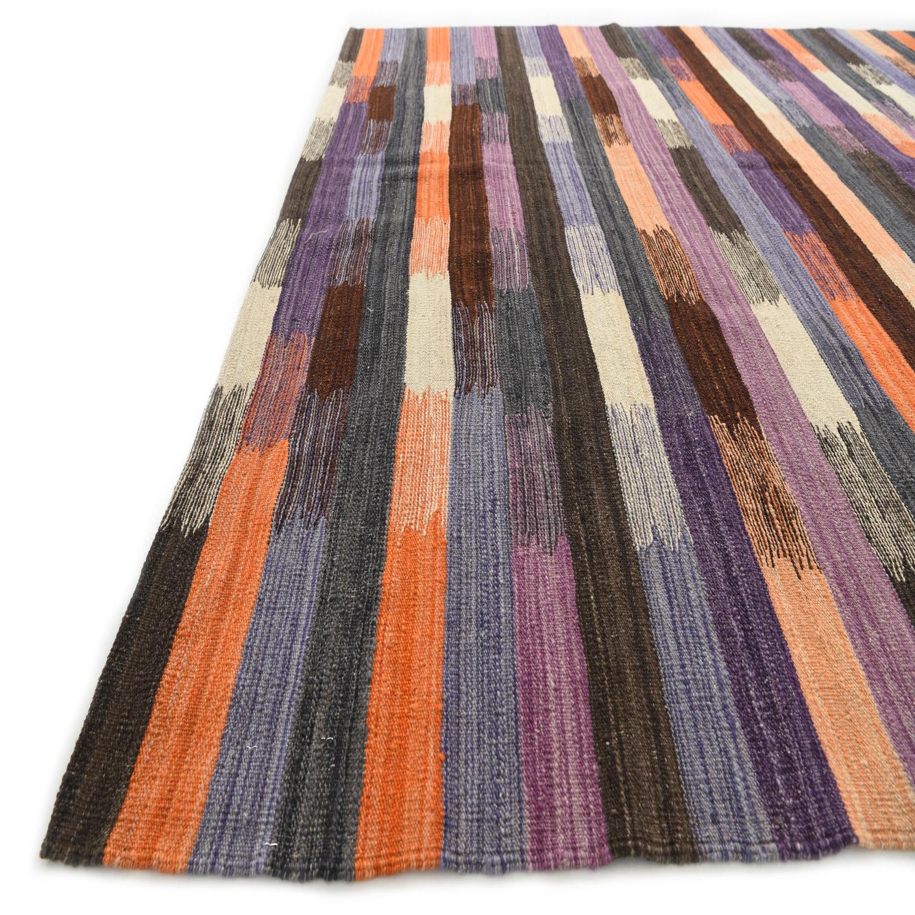 A 7x10 multi-colored rectangular wool flatweave rug with horizontal stripes in purple, orange, blue, brown, and cream.