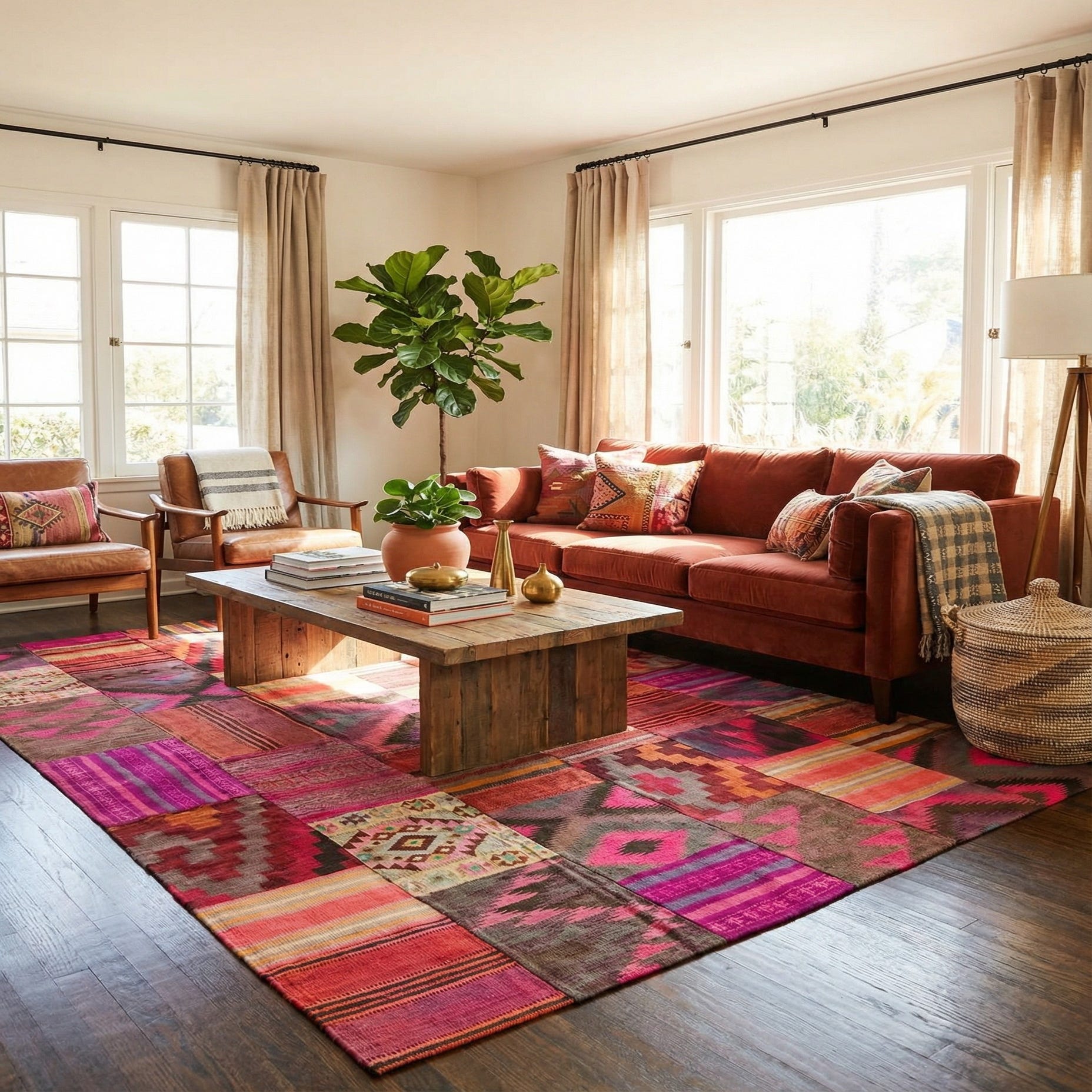 This rug works well in a layered, bohemian living room or eclectic loft where its rich colors complement natural-wood furniture and leather seating. It also anchors a dining area or entry hall, bringing warmth to neutral walls and providing a strong color statement against mid-century or contemporary pieces. Pair with velvet cushions, woven baskets and brass or matte-black accents to highlight the rug’s mix of warm and cool tones.