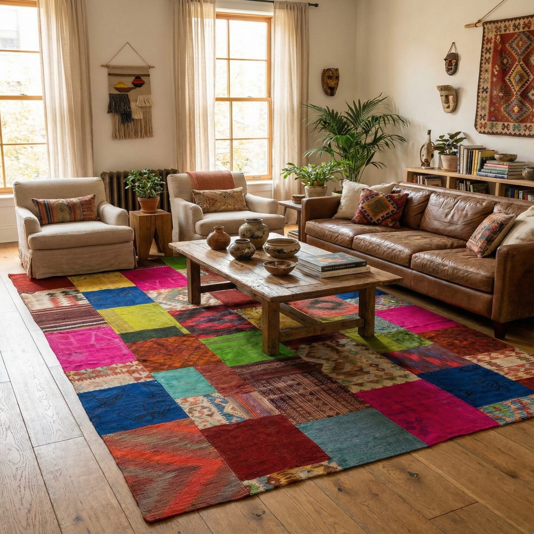 A vibrant 7x10 multi-colored Kilim Patchwork rug, handmade with various tribal and abstract wool flatweave patterns.