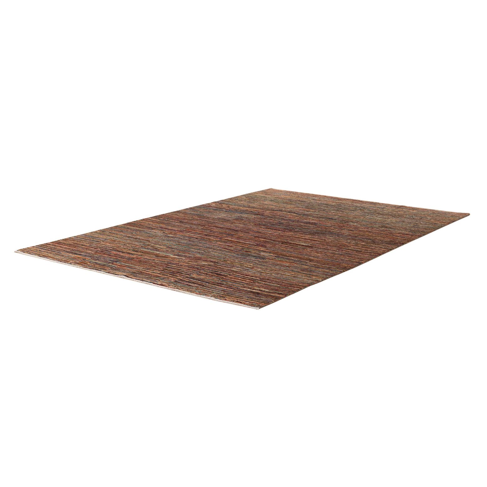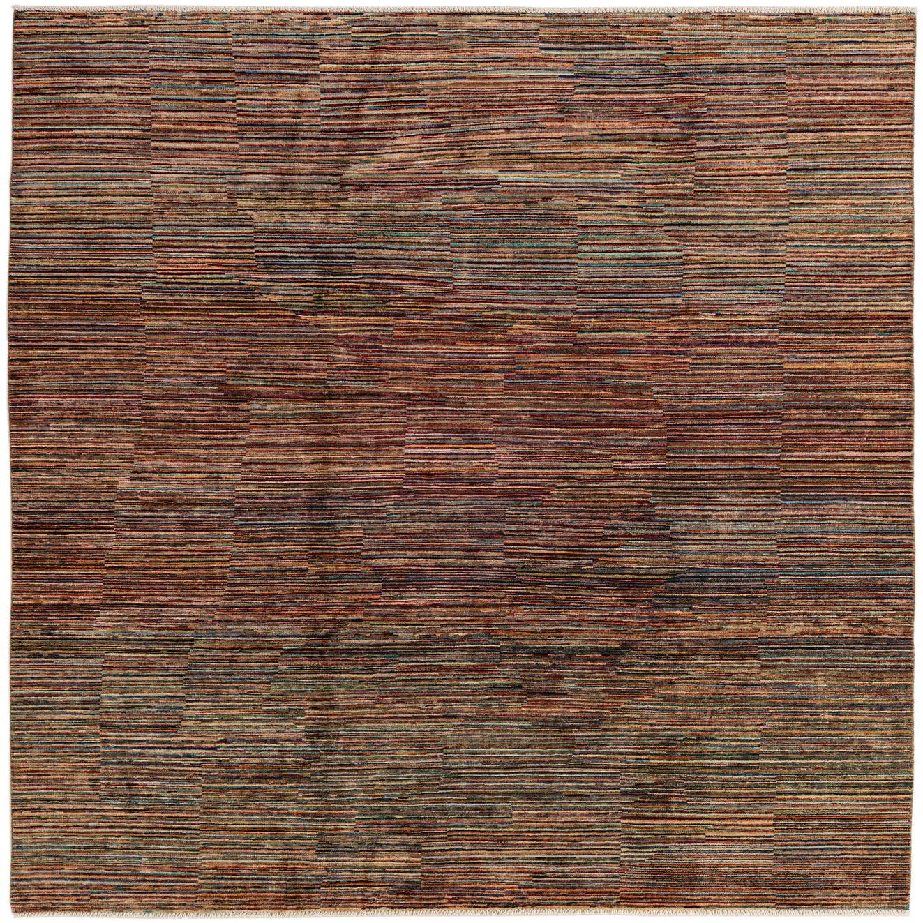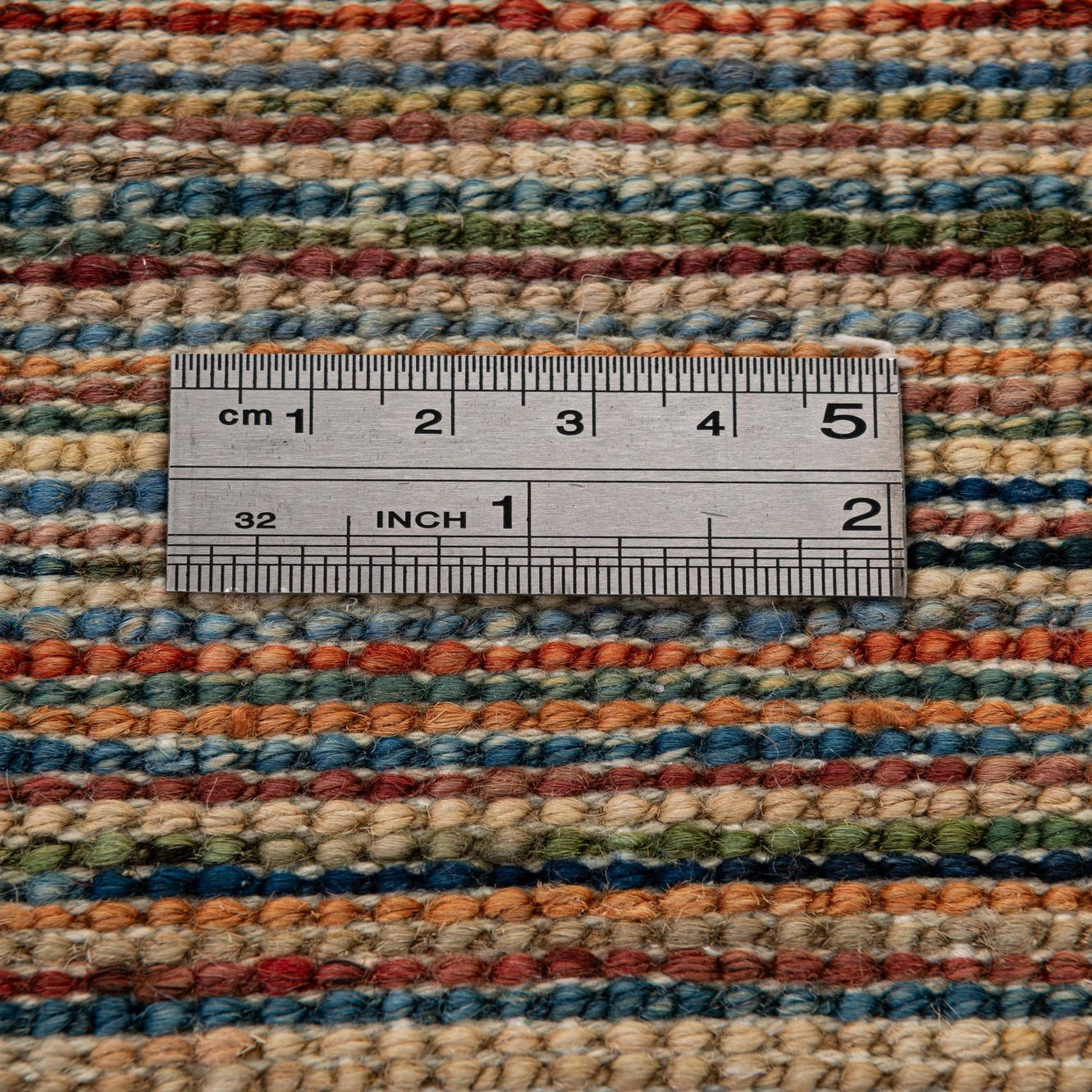 A 7x10 rectangular multi-colored wool rug with a modern striped and Oriental pattern, suitable for a living room.