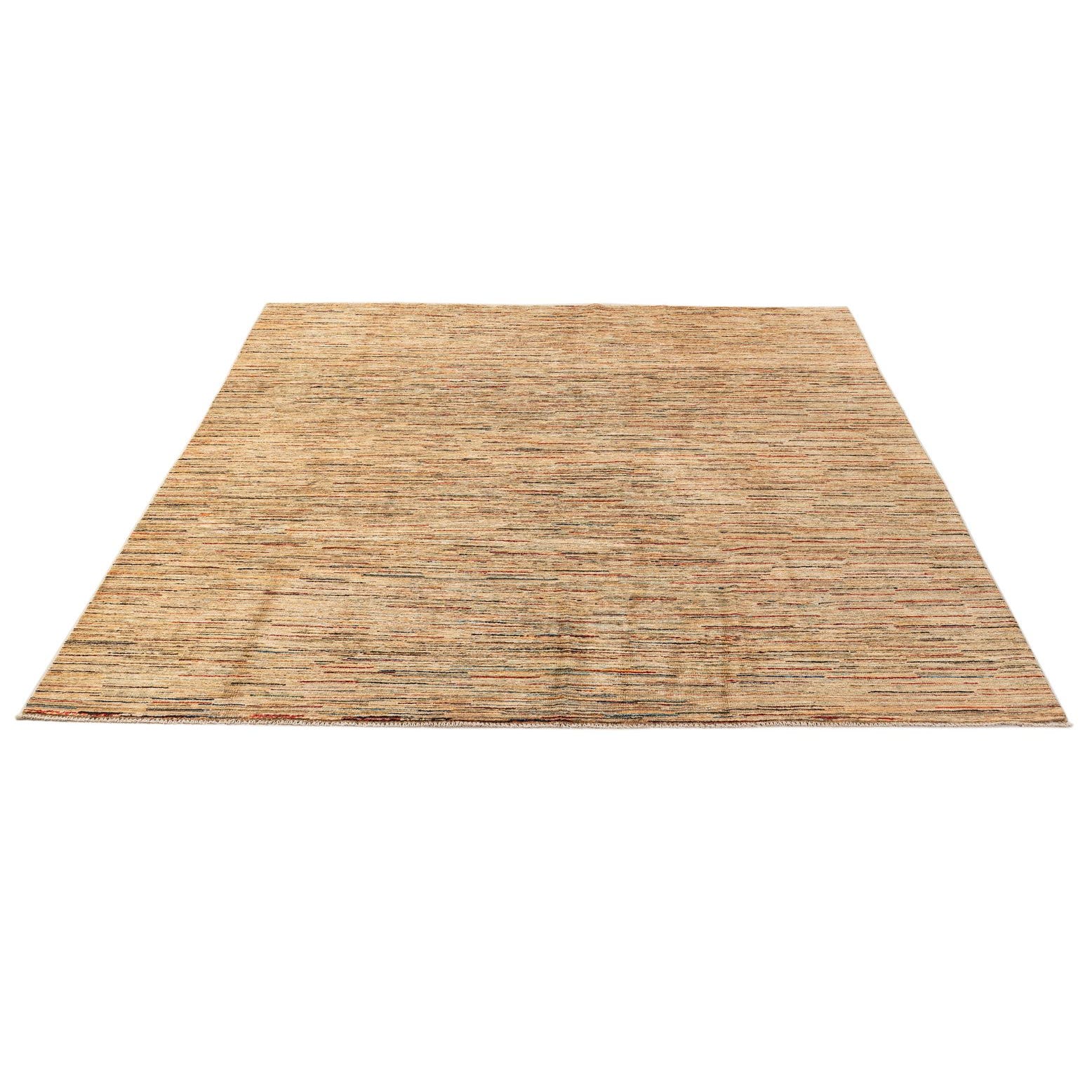 A 7x10 rectangular Modern Ziegler rug with a multi-colored stripe pattern on a light beige background, suitable for a living room.