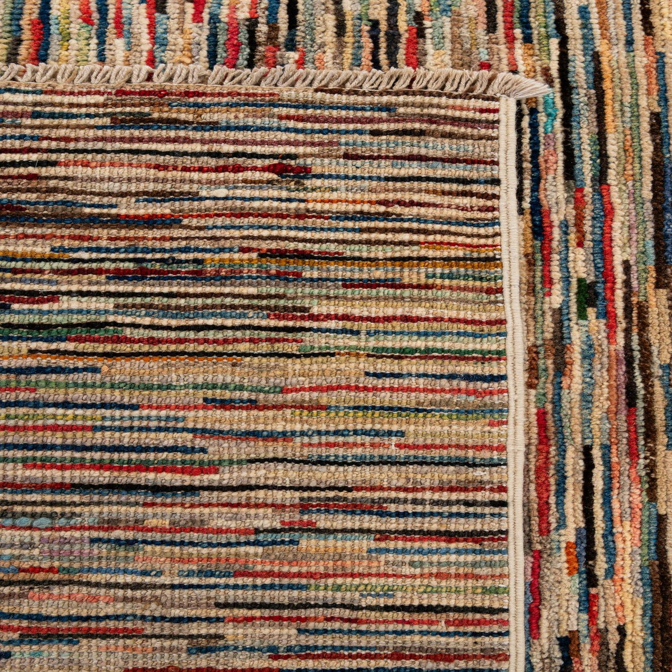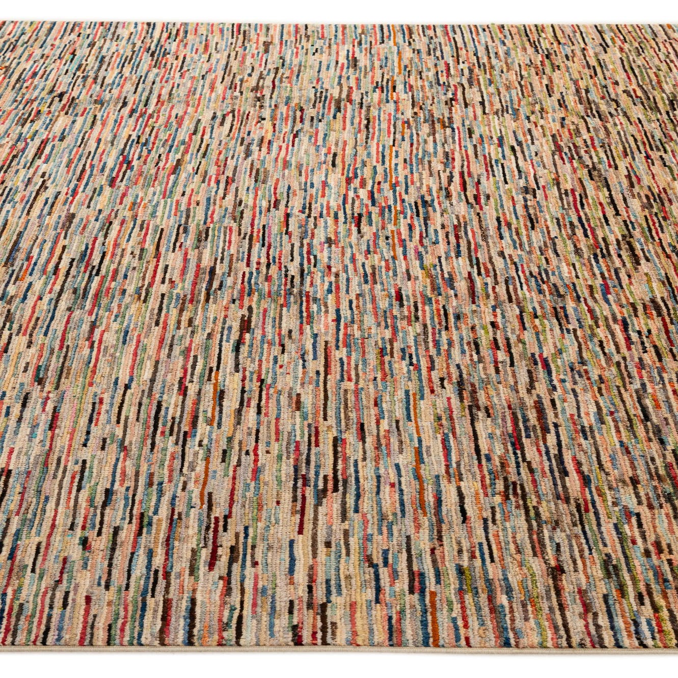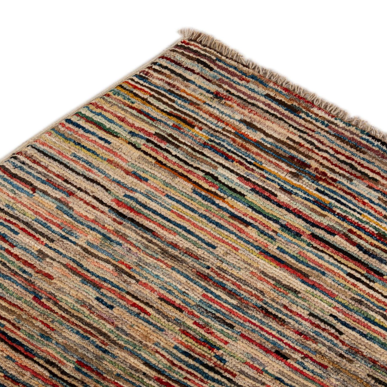 Hand-knotted in 100% wool, this rug presents a finely striated pattern of short horizontal dashes across a multi background. Warm beiges and ivories form the foundation while accents of black, blue and light blue, green, brown, orange, red, purple and pink thread through the weave, creating a painterly, low-contrast mosaic of color. The overall effect is contemporary and understated, with enough visual interest to enliven a room without dominating it.