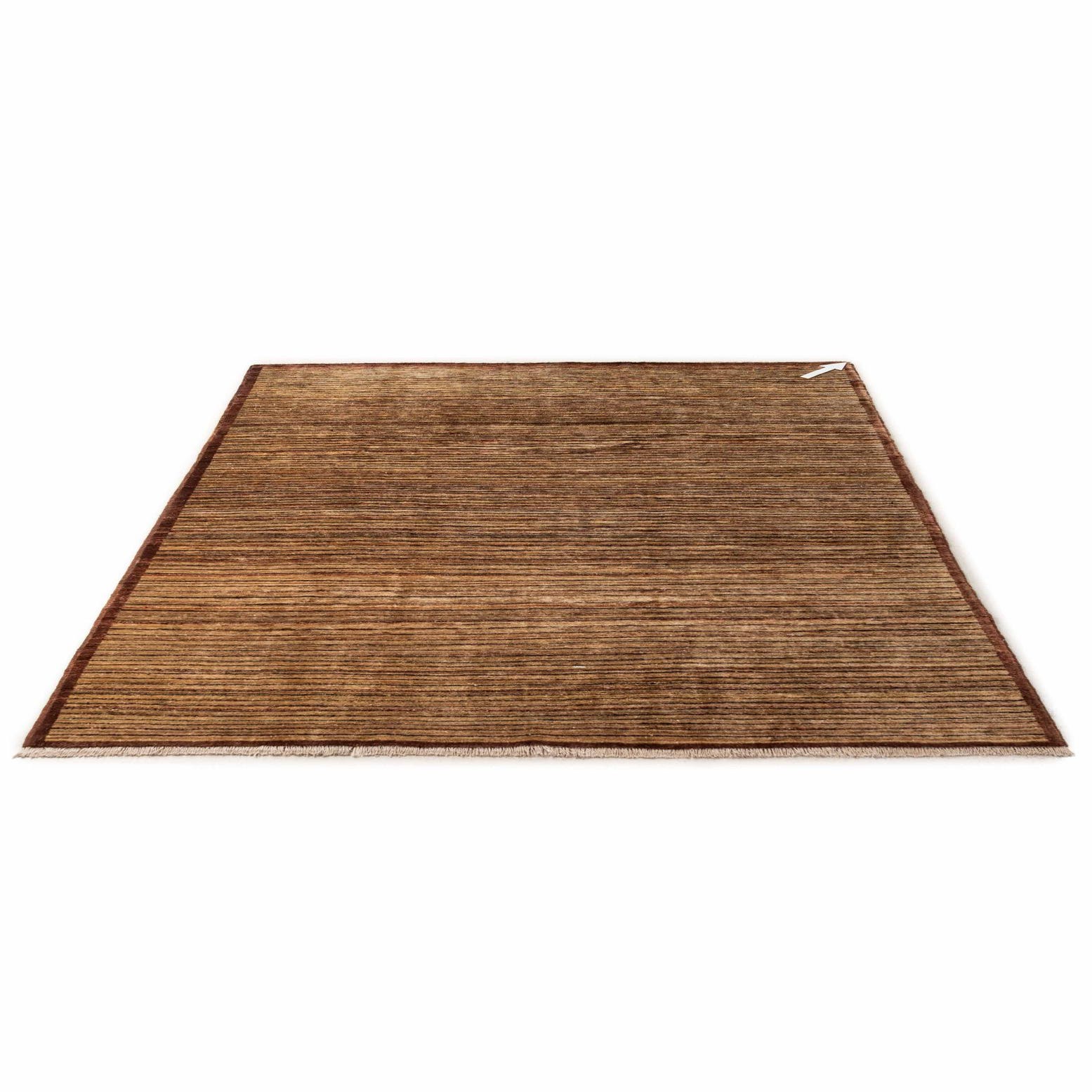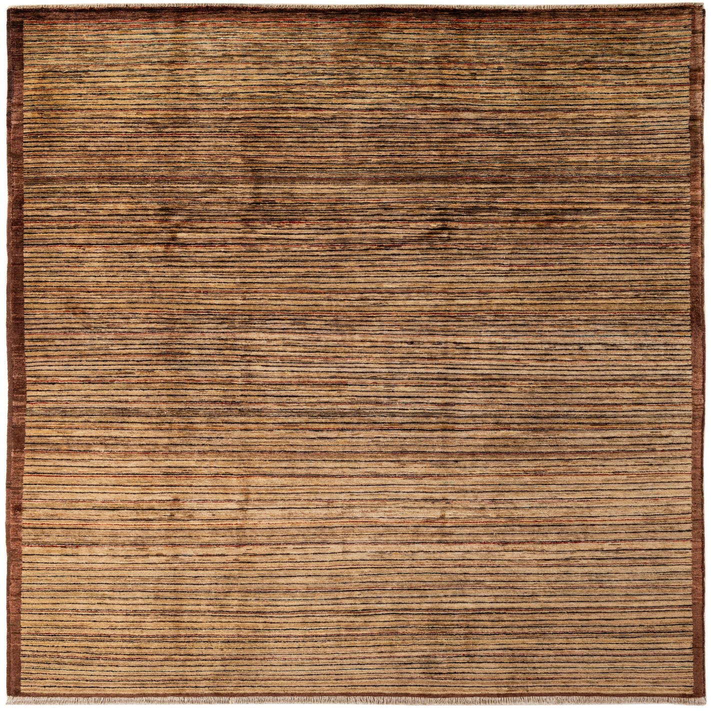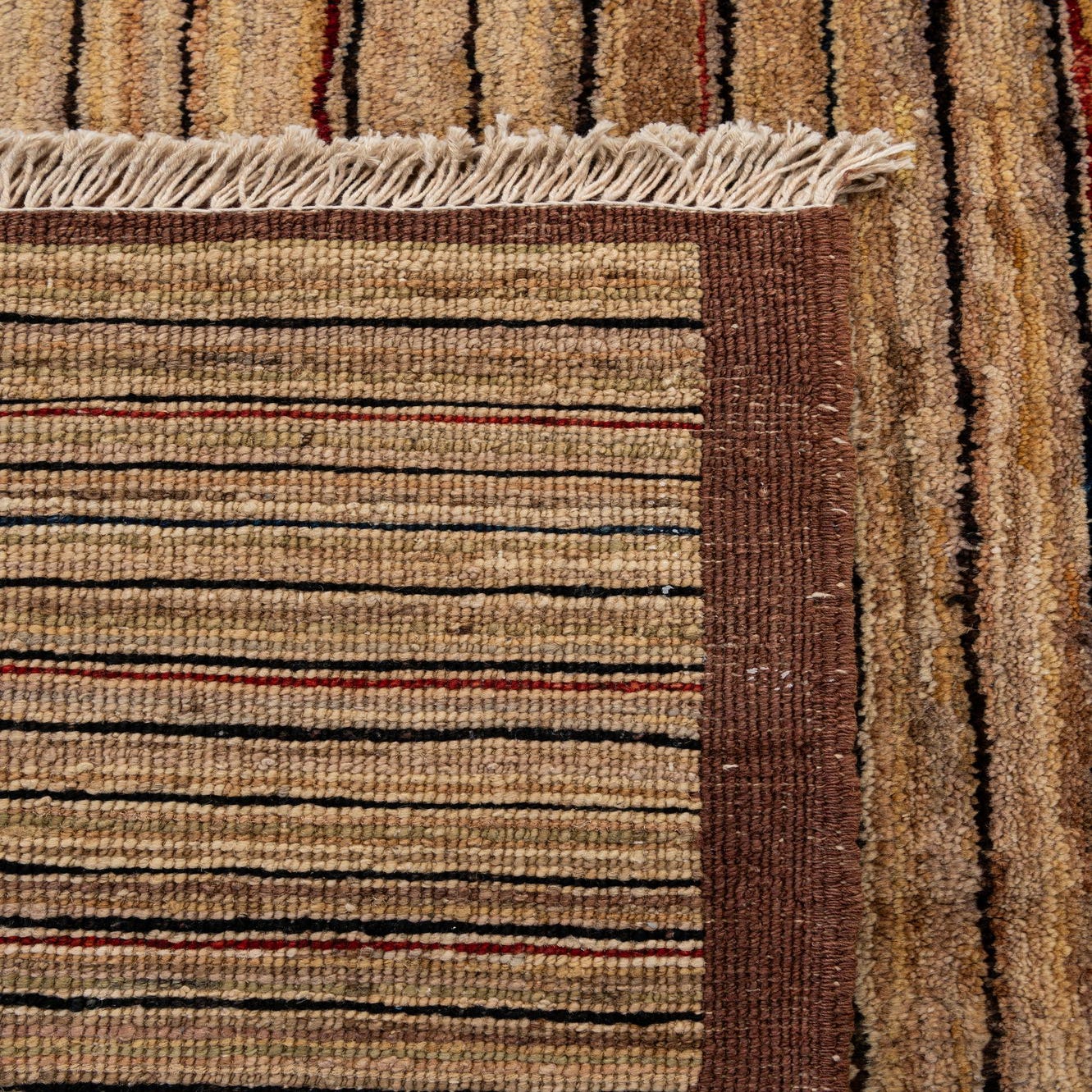 A 7x10 rectangular Modern Ziegler rug featuring thin, multi-colored horizontal stripes in earthy tones, ideal for a living room.