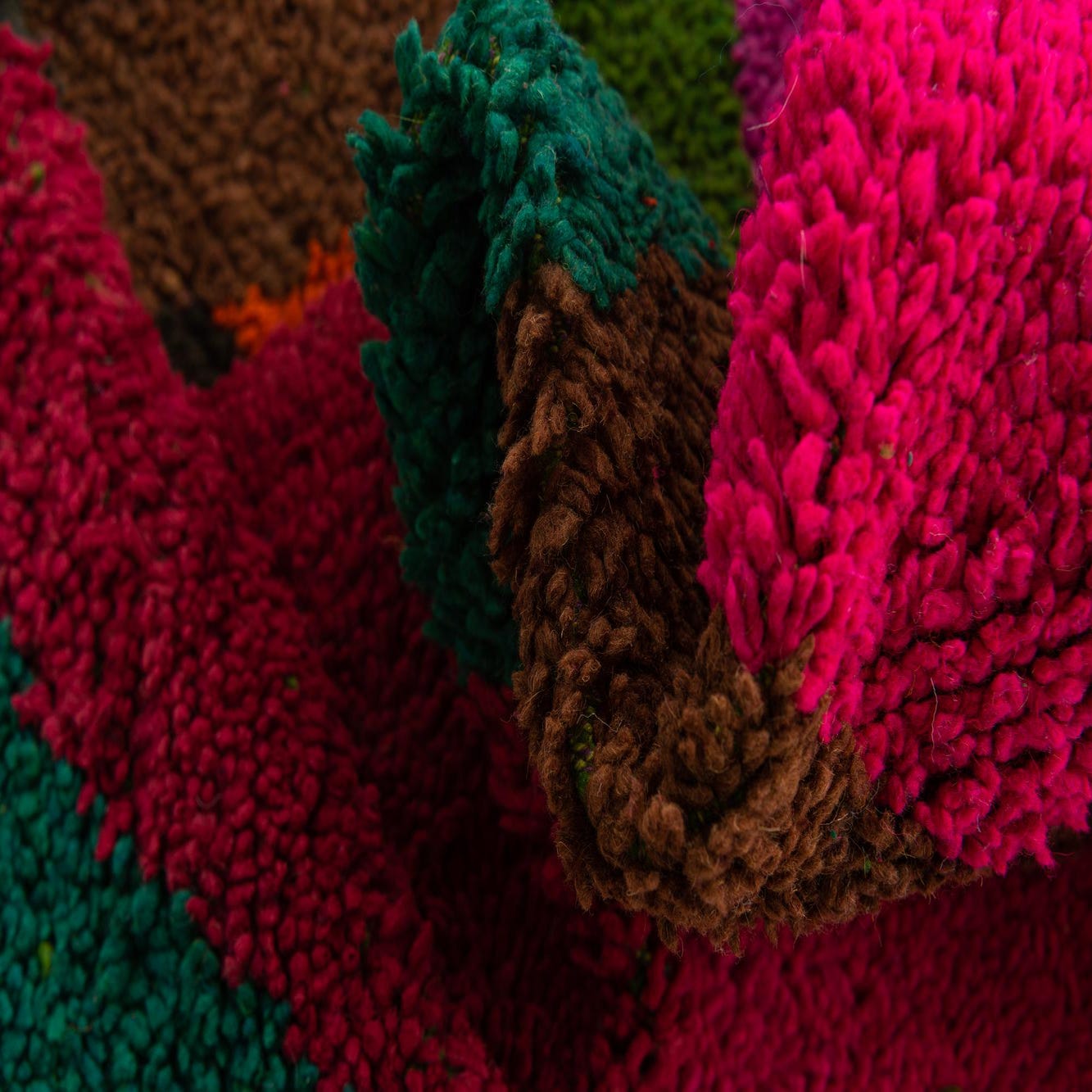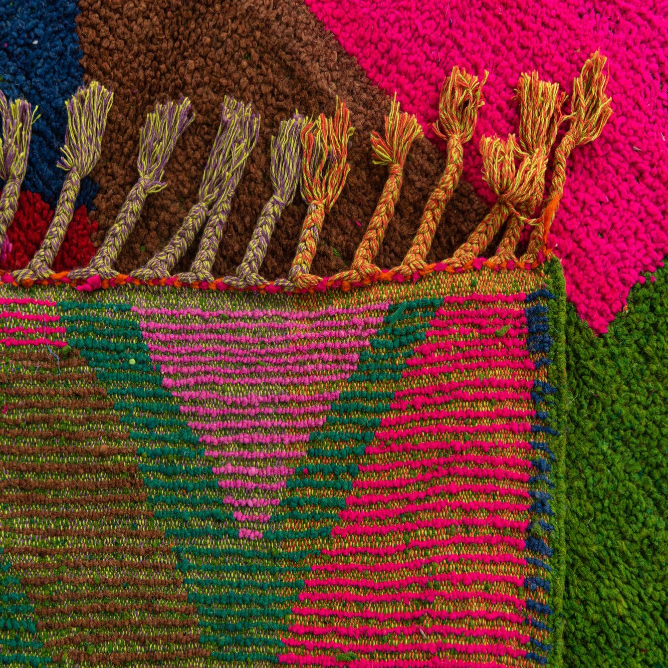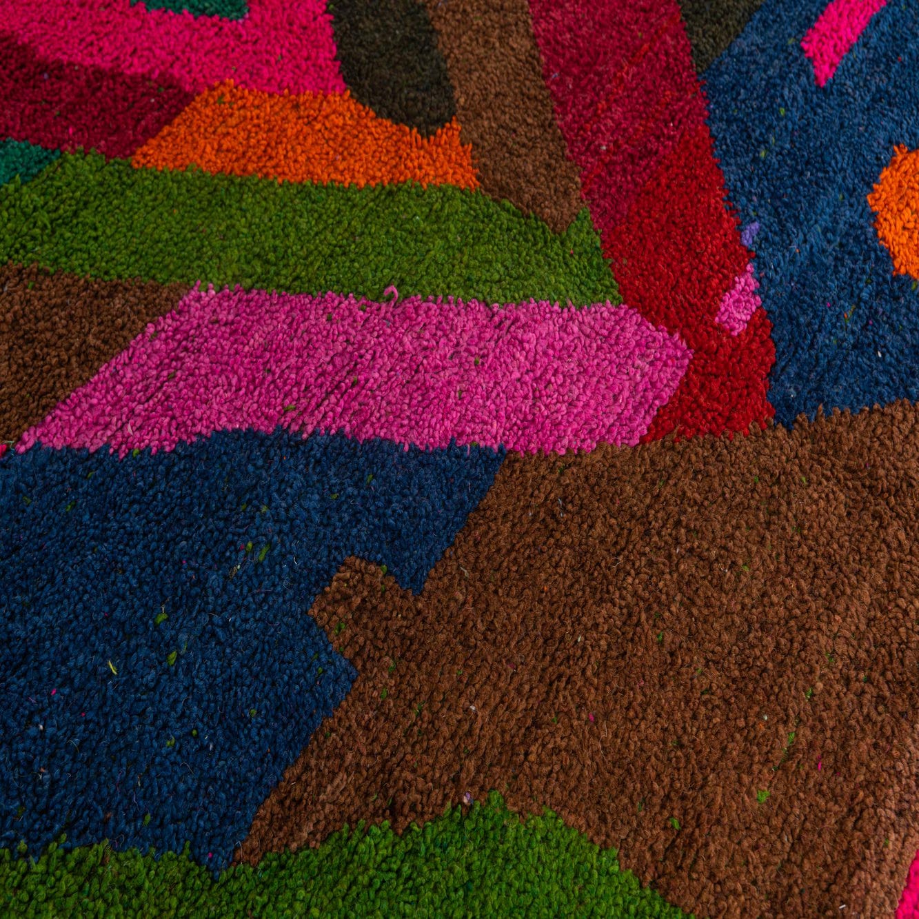 From our Moroccan collection, this 7x10 hand-knotted rug is crafted from 100% wool, ensuring a dense and plush feel underfoot. The rug features a vibrant and eclectic mix of colors including blue, brown, green, orange, violet, pink, red, and black set against a dynamic multi-colored background. Its pattern is composed of bold, abstract geometric shapes, reminiscent of traditional Moroccan design with a contemporary twist. The rug's texture showcases the high level of craftsmanship evident in hand-knotted pieces.
