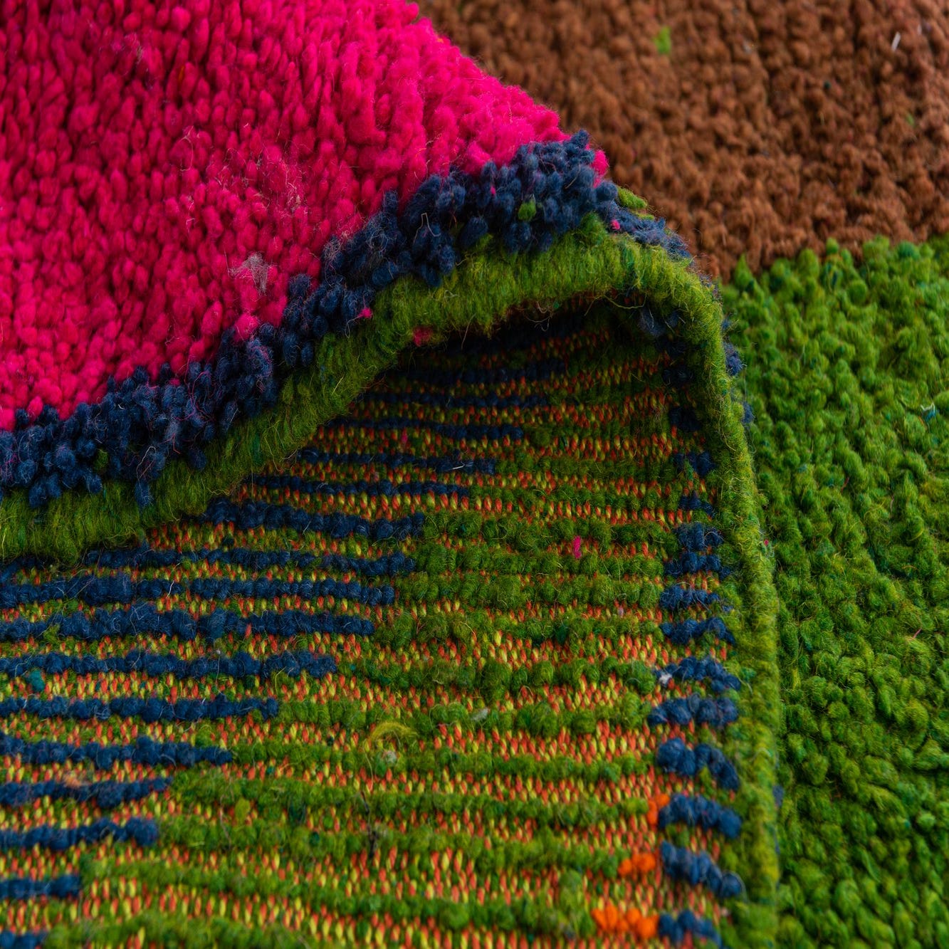Primary color is Multi. Colors in this rug include: Multi, Blue, Brown, Green, Orange, Violet, Pink, Red, Black.