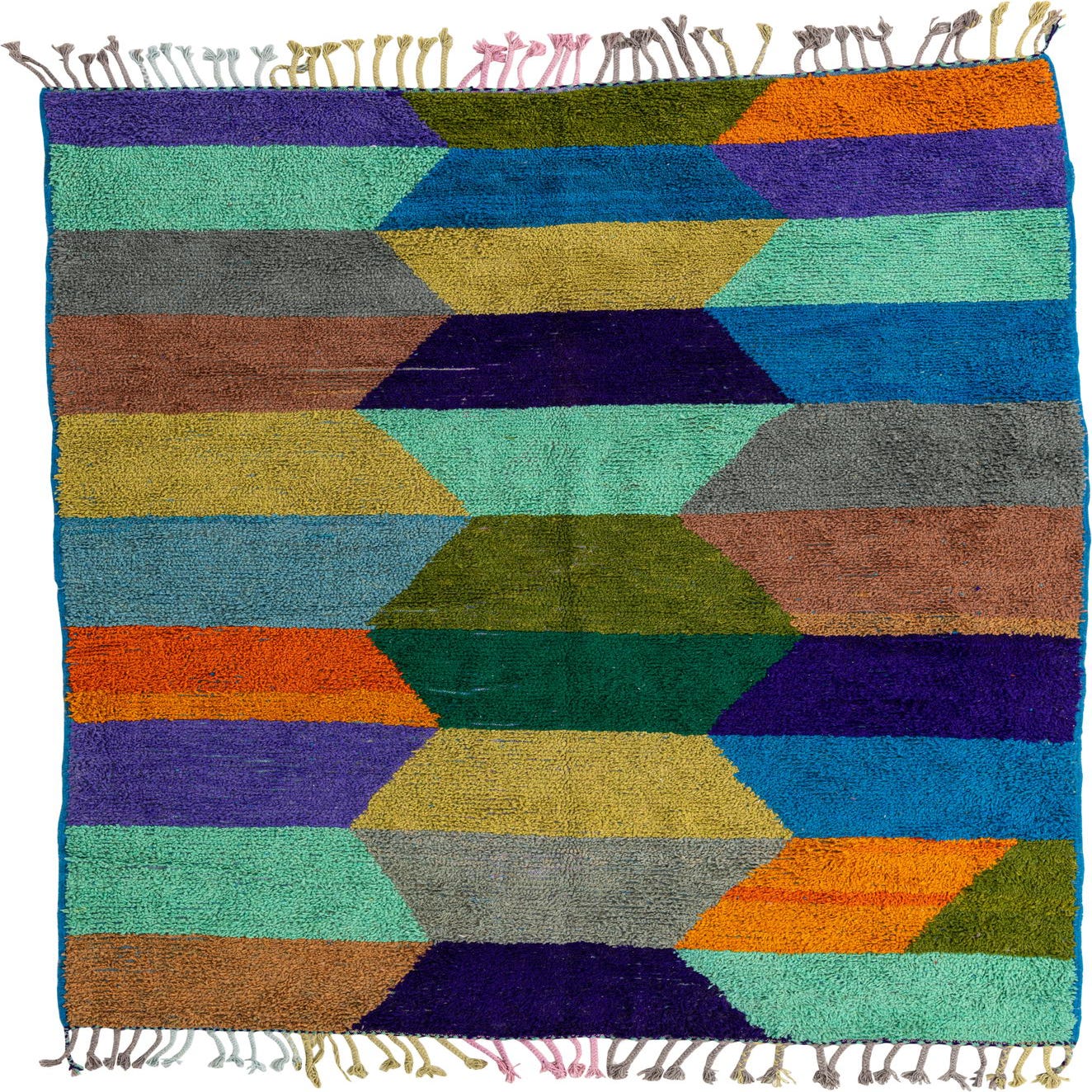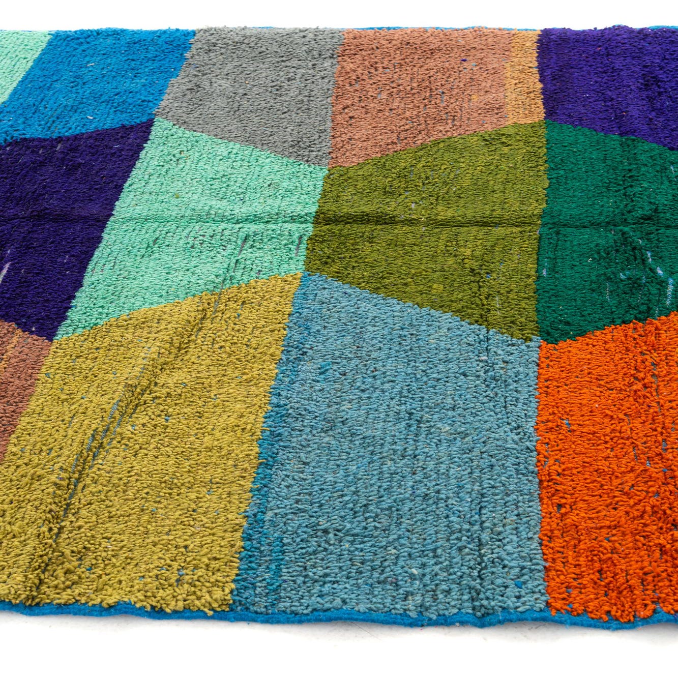 This rug works well where color and pattern can be a focal point: place it beneath a low coffee table to anchor an eclectic living room, layer it in a reading nook for added warmth and comfort, or use it to bring character to a neutral bedroom. It pairs nicely with mid-century silhouettes, warm wood tones, leather accents, or woven textiles and rattan to balance the saturated hues and geometric rhythm.