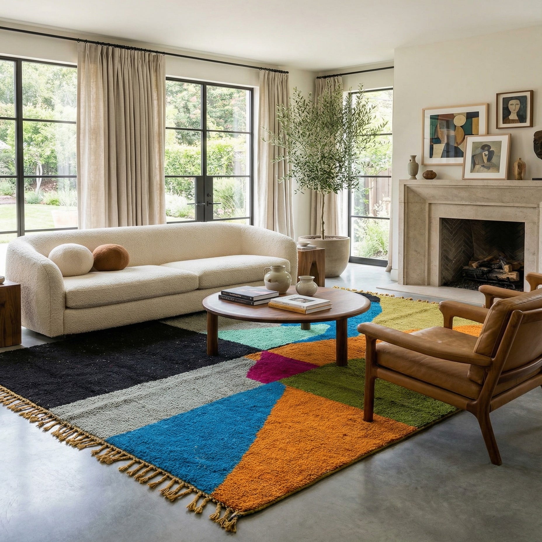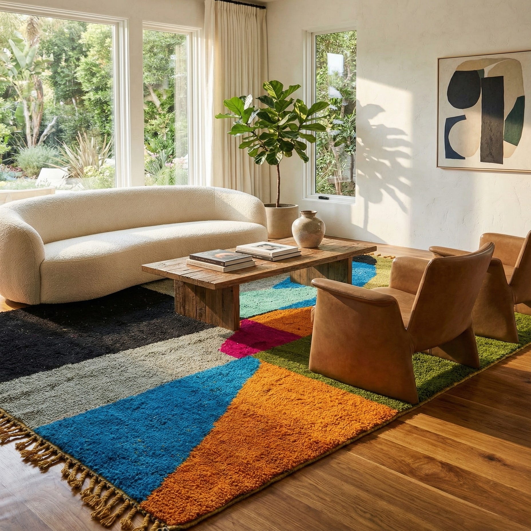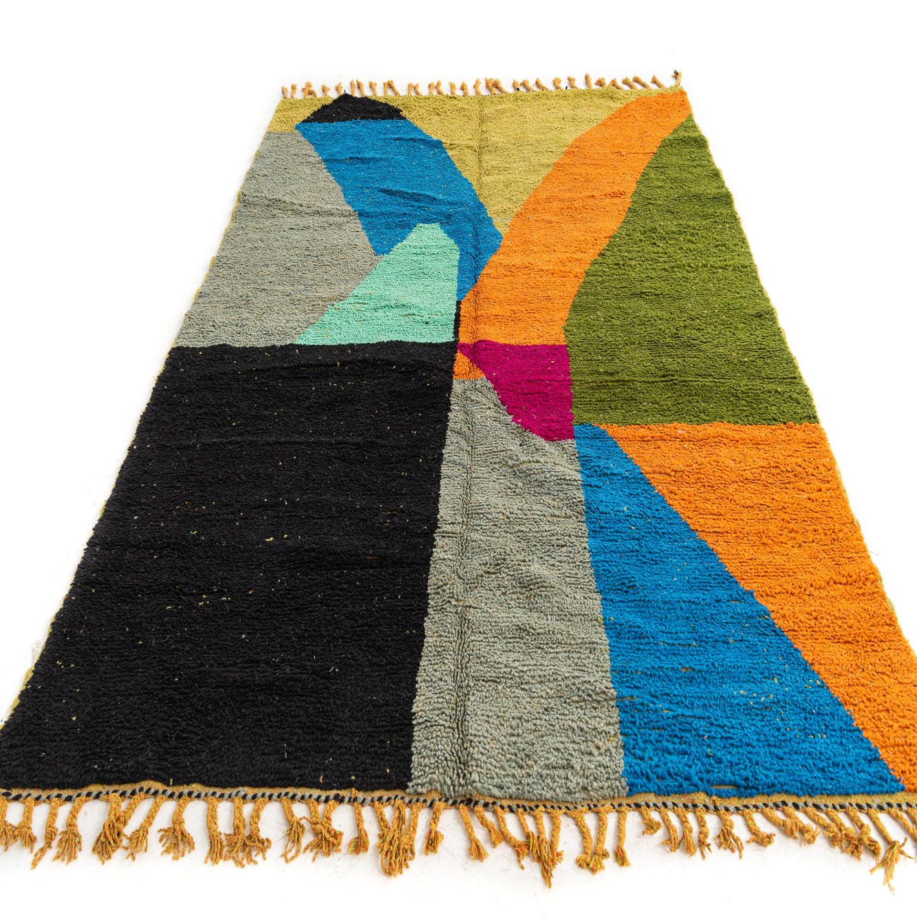 This Moroccan Collection rug offers a captivating blend of colors and a bold, contemporary design, hand-knotted from 100% wool for enduring quality. The pattern features an asymmetrical array of color blocks in black, blue, gray, olive, orange, and light green, set against a multi-colored background that provides a versatile palette to complement a range of interiors.