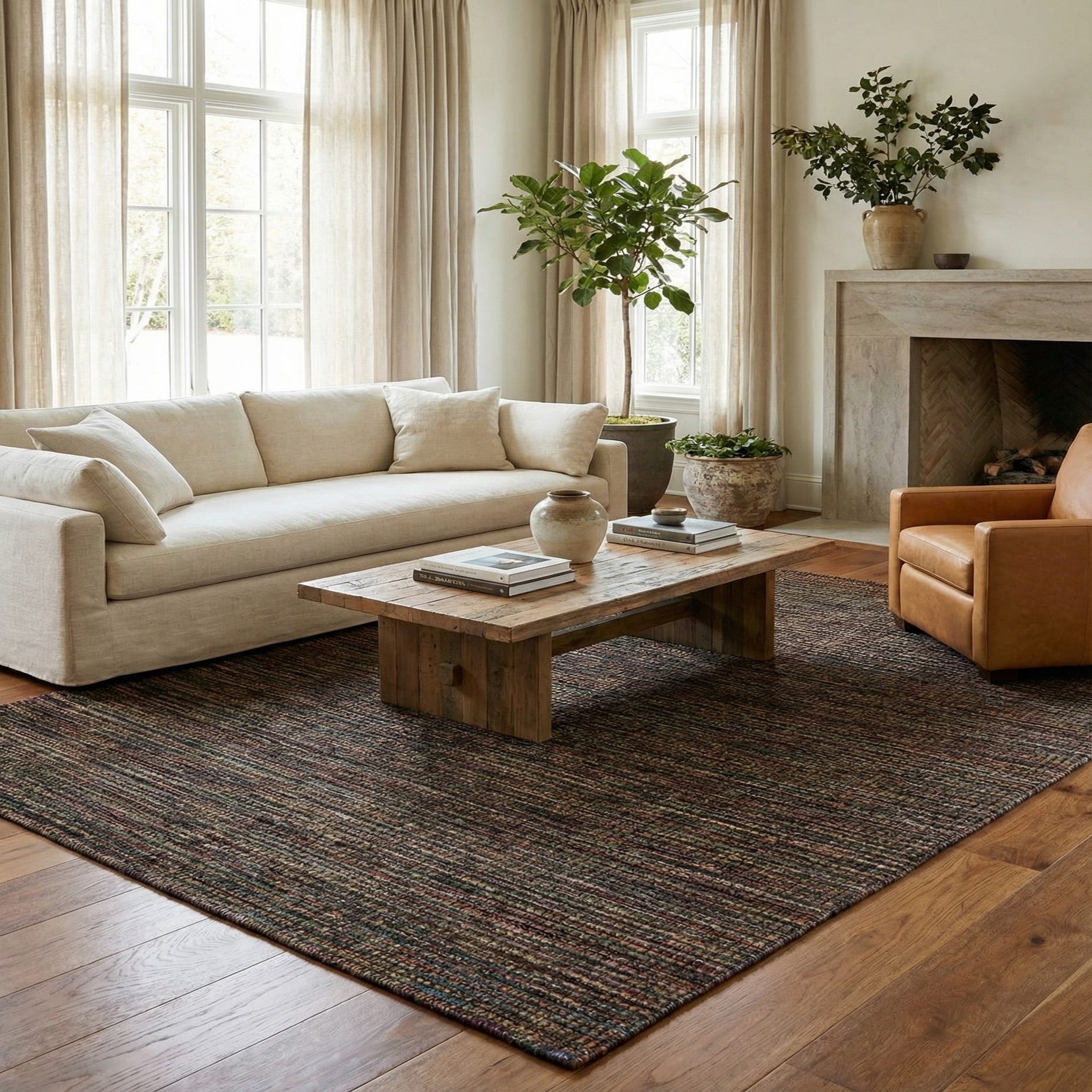 This versatile rug is well-suited for an array of interior design scenarios. Its earthy tones and texture can complement a rustic or bohemian decor, anchor a modern minimalist room with a touch of warmth, or add character to a traditional setting. Its size makes it suitable for living rooms, dining areas, or large bedrooms, where it can help define the seating or dining space and bring cohesion to the room's design elements.