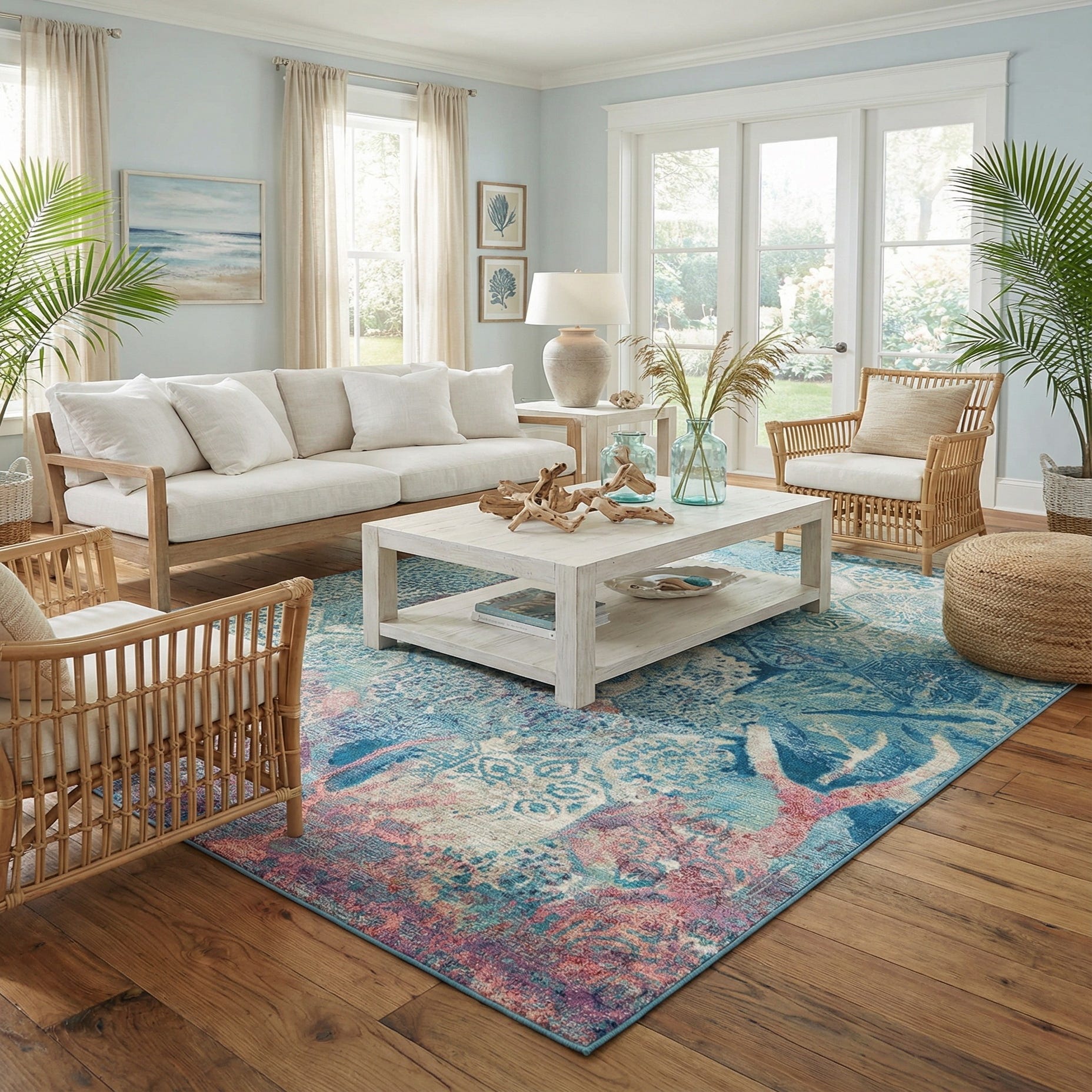 A 7x10 rectangular rug featuring a multi-colored coastal design with coral and intricate blue and white patterns, suitable for indoor or outdoor use.