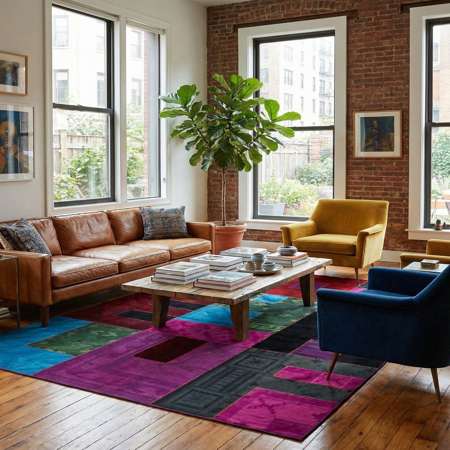 A vibrant 7x10 rectangular multi-colored wool patchwork rug featuring abstract patterns in red, purple, pink, blue, green, and black.