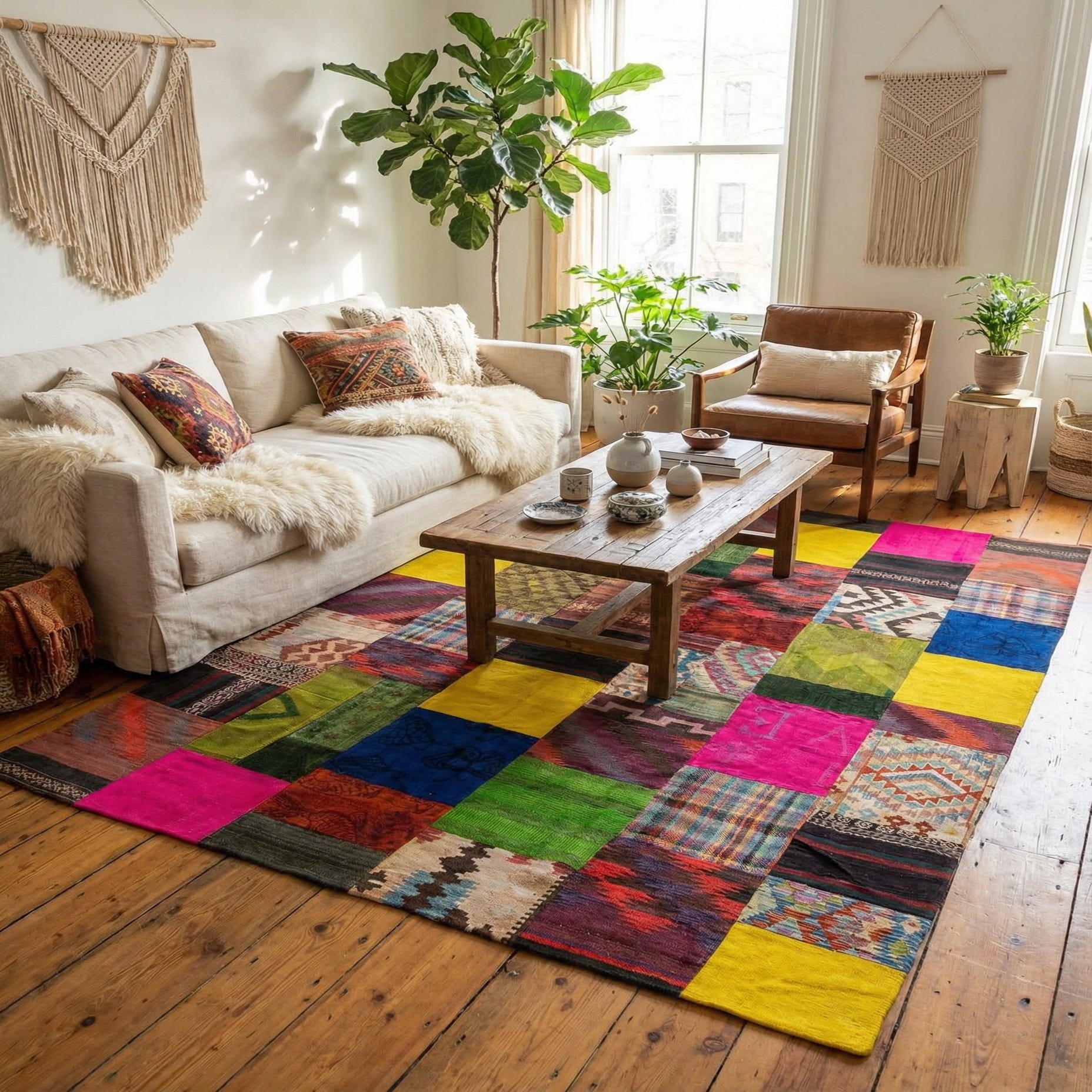 A vibrant 7x10 multi-colored rectangular wool rug with a patchwork design, featuring various Persian, modern, and abstract patterns in bright hues like pink, yellow, blue, and green.