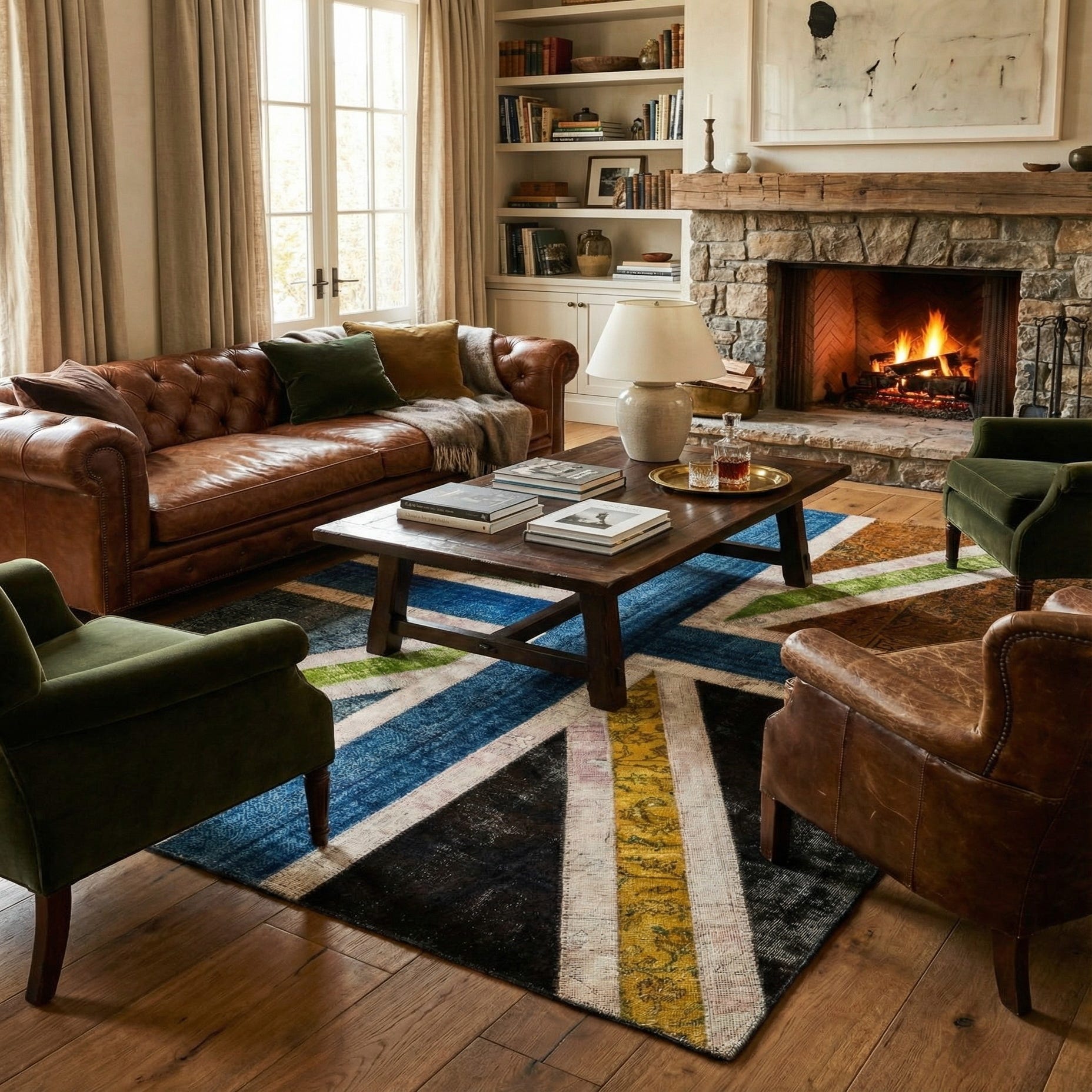 A 7x10 rectangular multi-colored wool rug with a distressed Union Jack flag pattern in blue, green, yellow, brown, and black.