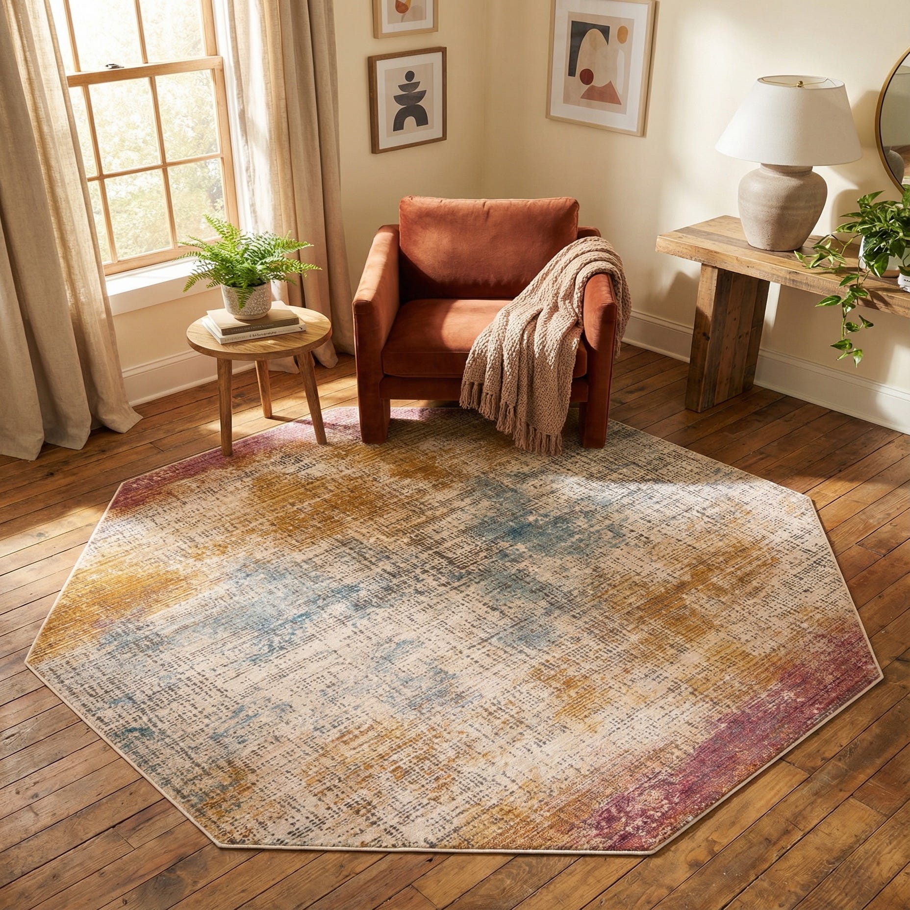 The octagonal shape makes this rug a natural choice for round or curved furniture arrangements — think beneath a circular dining table, centered in a cozy seating nook, or placed in an entry to define a foyer. Pair it with light wood or mid-century furnishings and linen upholstery to emphasize the soft color story, or use it as a layered accent over a neutral sisal for added warmth and visual interest in an eclectic living space.