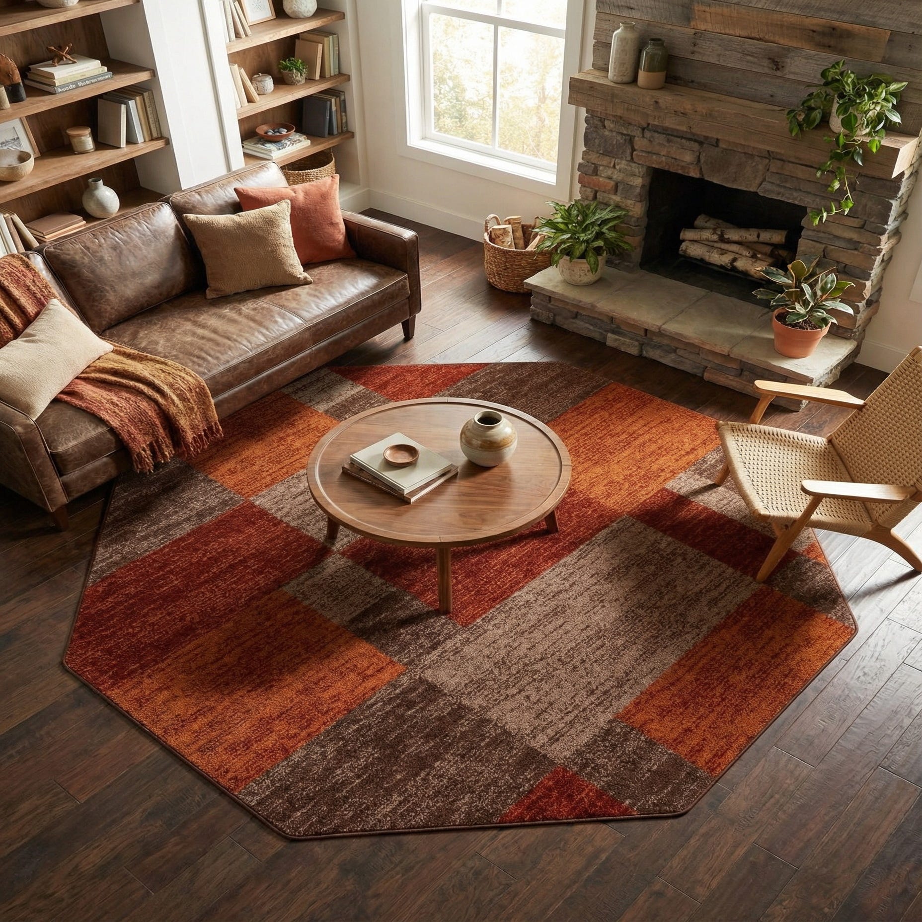 A bold geometric block pattern organizes warm, earthy tones into a clean, contemporary layout. Rectangular and square fields in burgundy, orange, brown and beige sit against a multi-hued background, creating a layered, slightly heathered effect that gives the surface visual depth. The octagonal shape adds architectural interest while keeping the overall look modern and grounded.