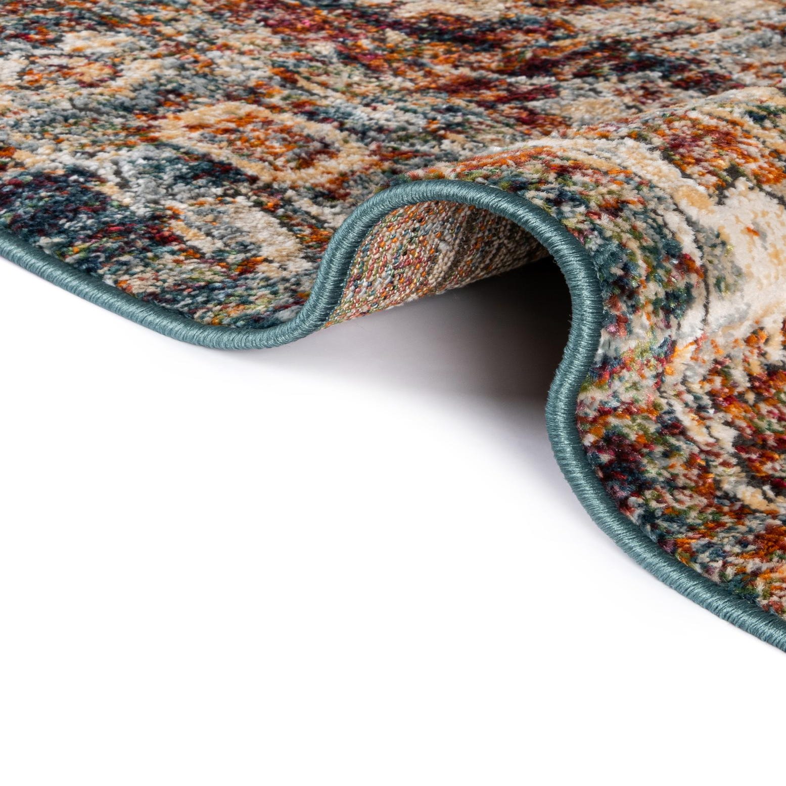 A worn-vintage medallion pattern gives this octagonal rug a layered, collected look. A multi background holds a mix of warm rusts and orange at the center, softened by ivory and beige highlights, while deep blues, black, green and touches of red trace the ornate border and floral motifs. The distressed detailing creates visual texture across the face of the rug, where the traditional motifs read with a slightly faded, timeworn character.