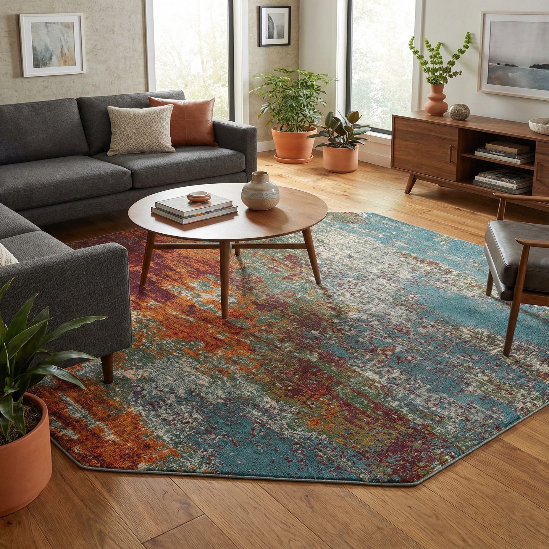 An 8' 2 x 8' 2 octagon rug featuring a modern abstract pattern in multi-colored hues of teal, orange, and deep red.