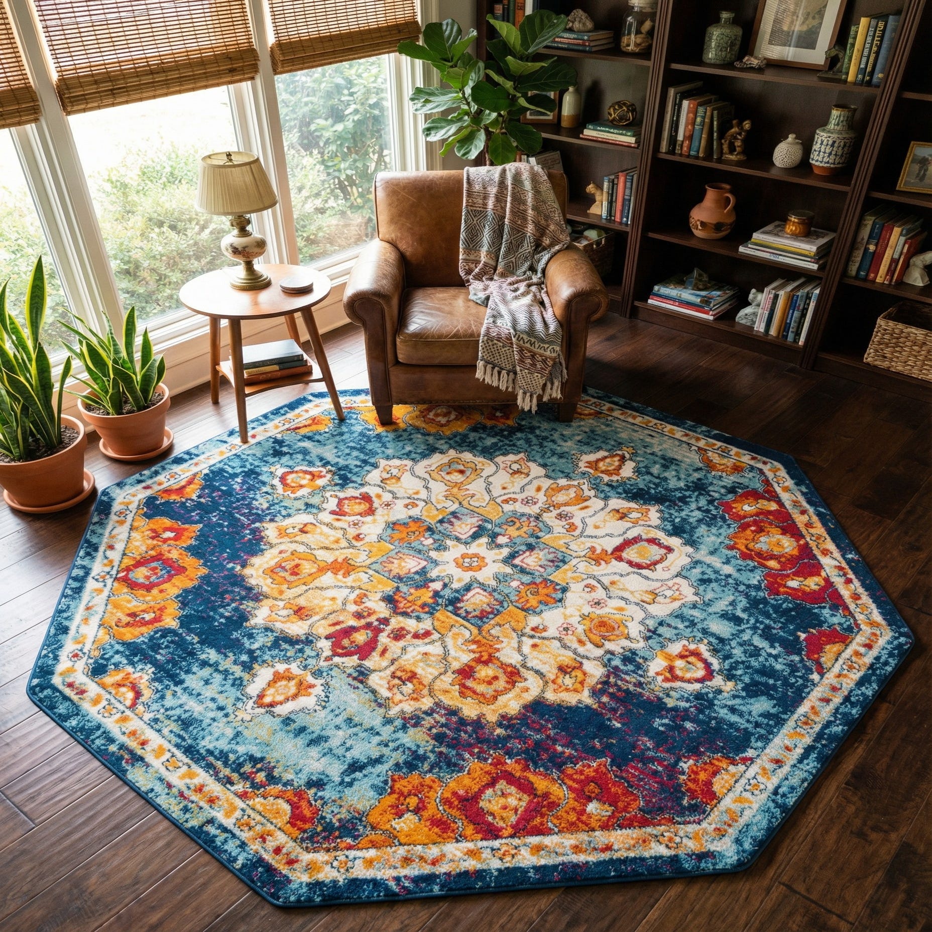 This piece works well in transitional, global, or eclectic interiors. Place it in an entry or foyer to introduce color and pattern, under a round or octagonal dining table to mirror the table shape, or anchored beneath a coffee table to define a cozy seating area. It pairs naturally with warm woods and leather, navy or teal upholstery to echo the blue field, or ochre and rust accessories to pick up the rug’s orange and red tones.