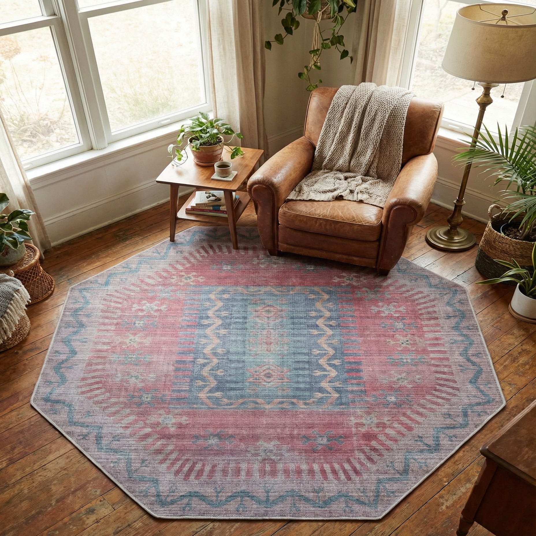The octagon shape and balanced colorway make this piece especially useful as a focal mat in an entryway, centered beneath a round dining table, or to define a small seating area. It pairs well with mid-century and eclectic furnishings to soften angular lines, complements coastal and bohemian palettes, and adds color against warm wood floors or neutral sofas.