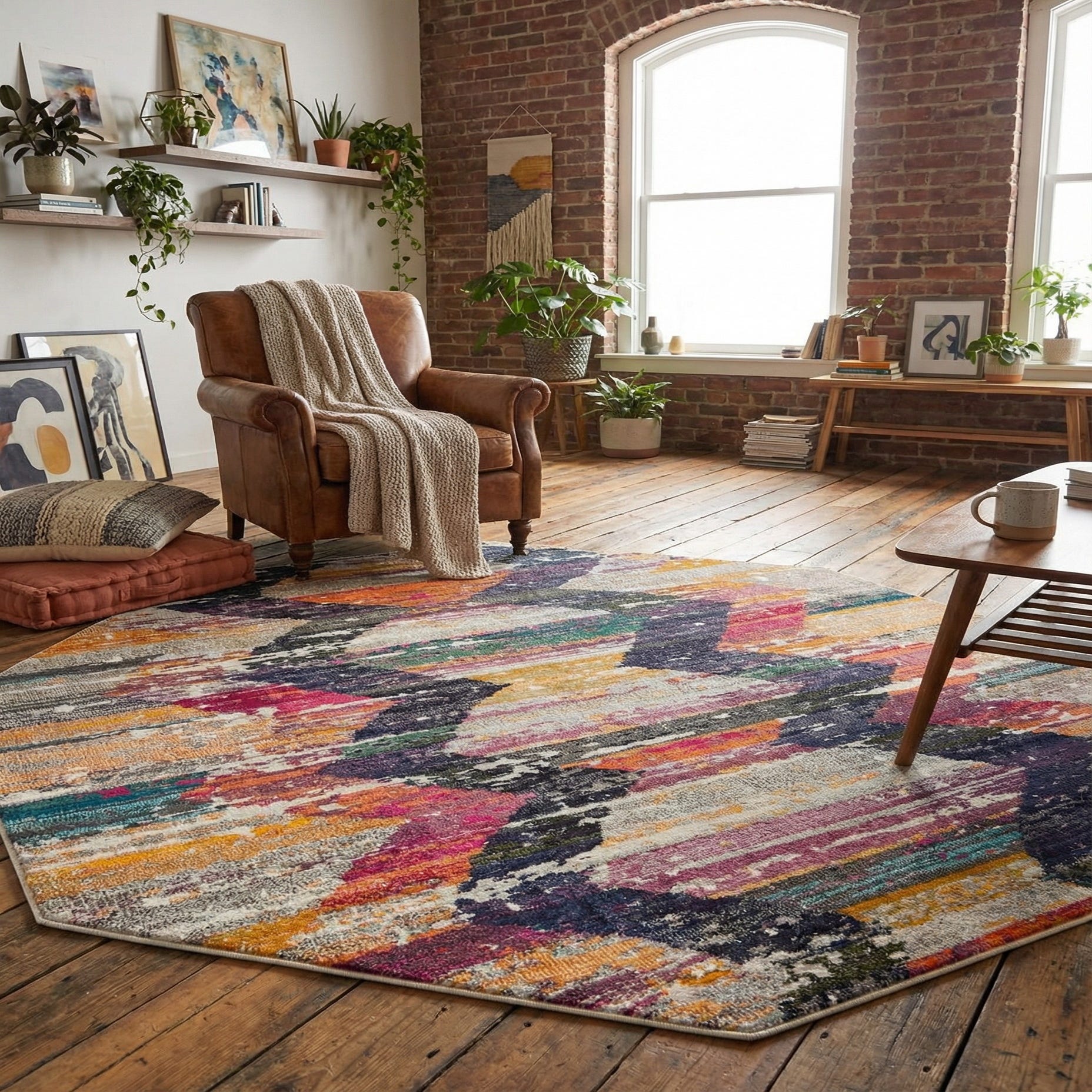 This rug works well as a focal point in contemporary living rooms or beneath a round dining table where the octagon shape complements circular seating arrangements. Pair it with mid-century wood furniture or clean-lined modern pieces to let the colors energize a neutral palette, or layer it with woven textures and rattan for a more eclectic, bohemian feel. It also suits a creative home office or a bright entryway where the vibrant tones can set an inviting tone.