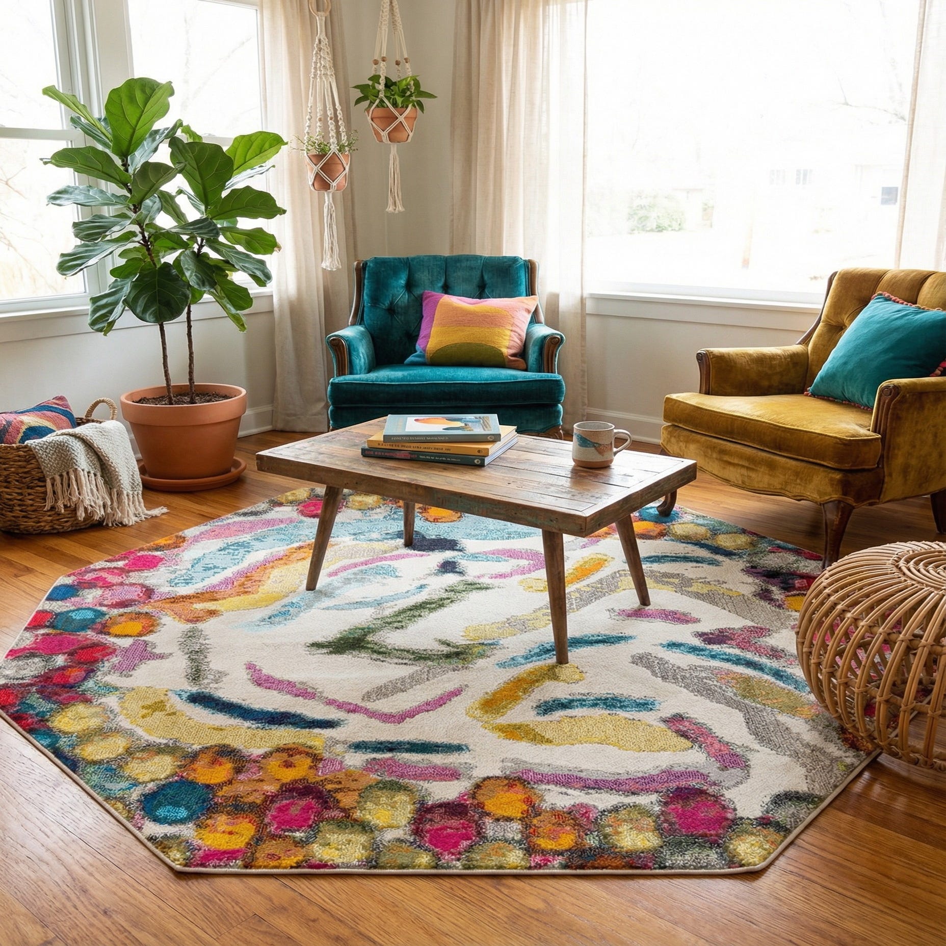 Machine-made from 100% polypropylene, this rug delivers color and pattern with practical durability for everyday rooms. It works well beneath a small seating group in a contemporary living room, as a focal anchor in an eclectic bedroom, or as a bright, shaped layer under a round or octagonal dining table in a casual dining nook. Pair it with neutral upholstery to let the palette pop, or mix it with other bold accents and warm woods to create a lively, collected look.