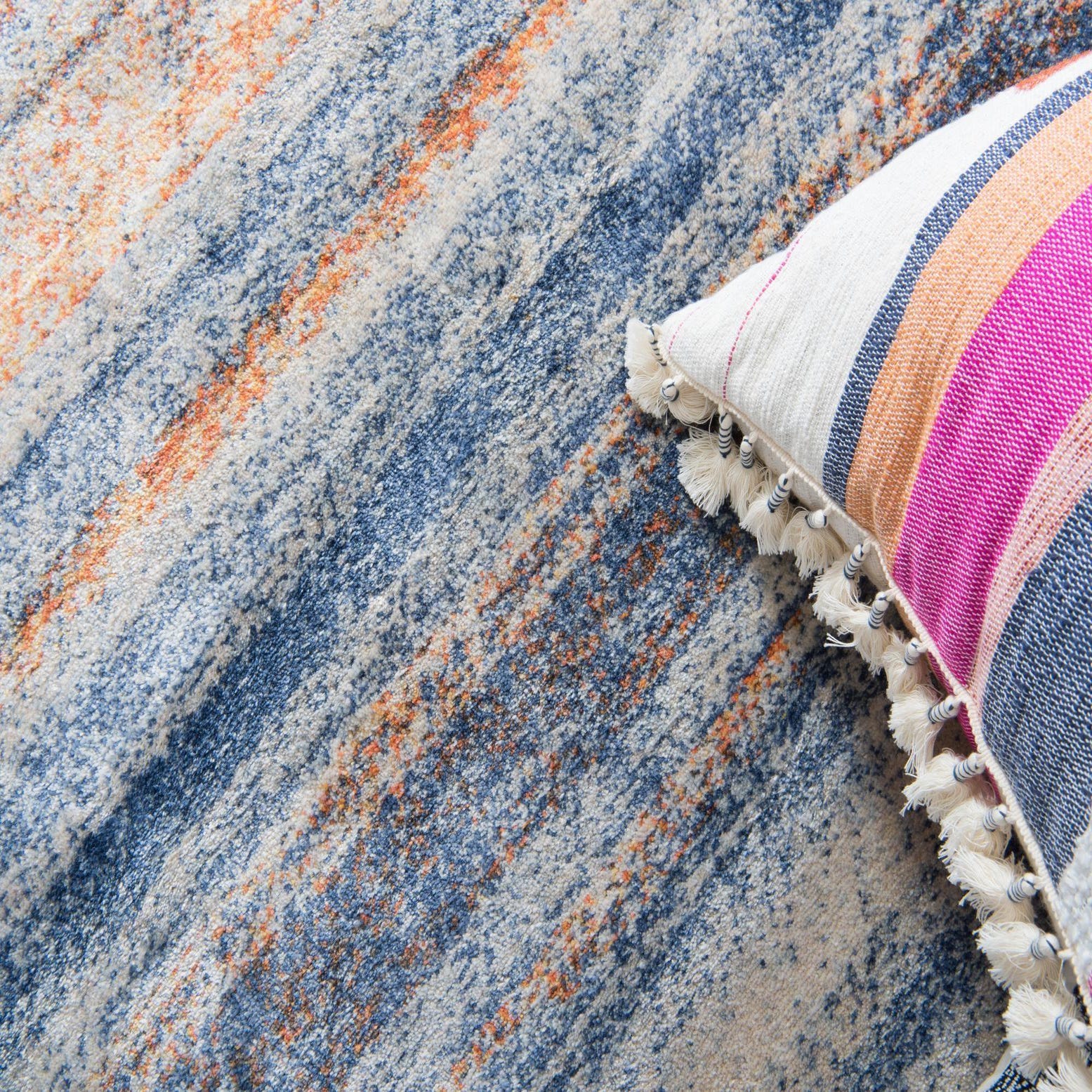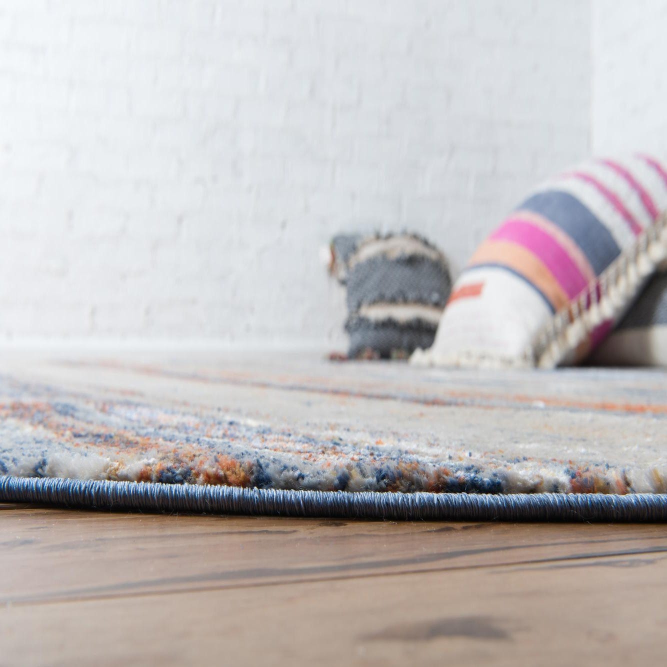 The rug adds color without calling attention to itself. The pattern is subtle not boring. I'm put a matching one in the dining room to pull things together - the variations in color due to the pile make them seem to be two different rugs. The rugs arrive folded but work themselves back to flat quickly. Heavy books on the corners help. I would buy them again in a heartbeat.