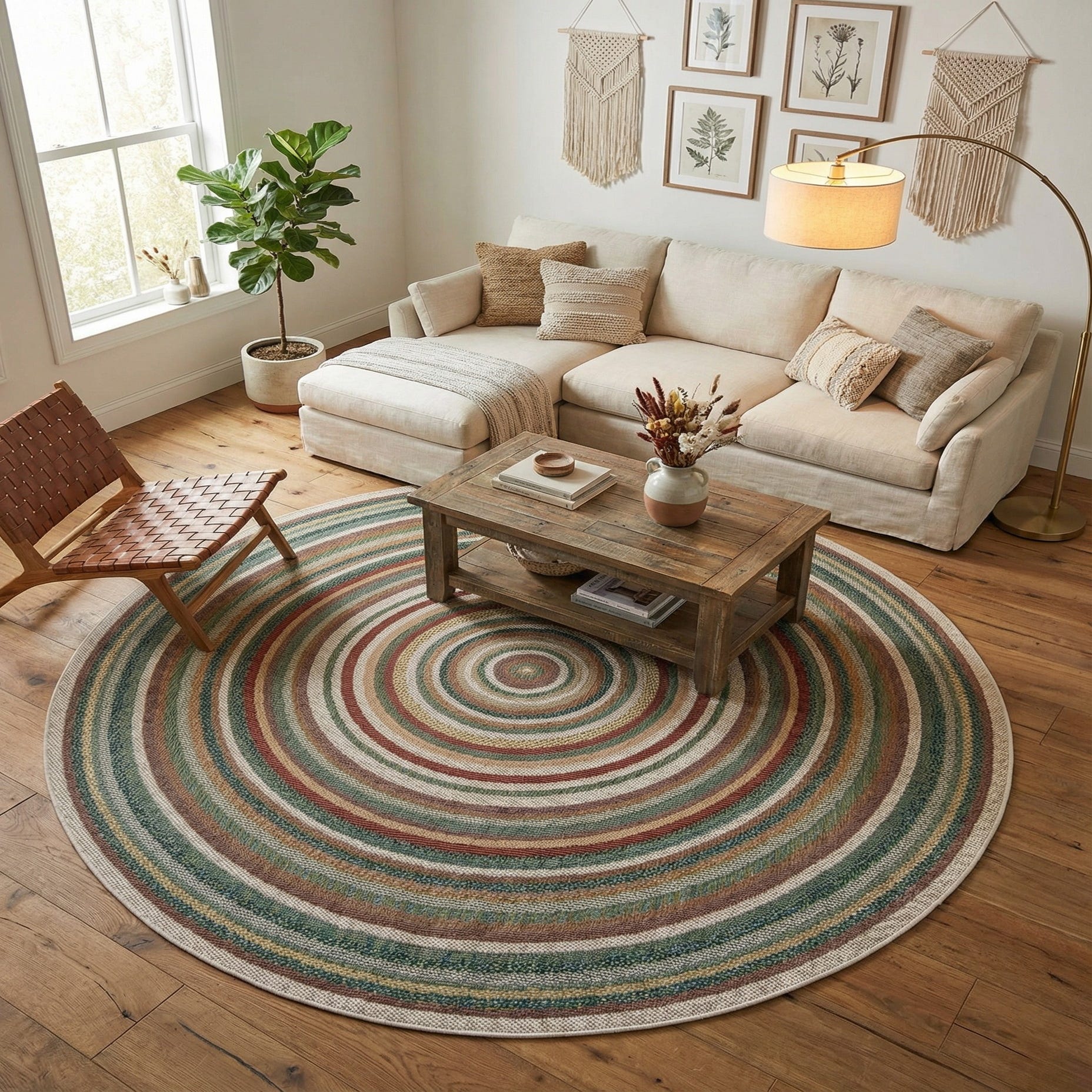 A 7'10" round multi-colored braided rug with concentric stripes of green, red, brown, and cream, suitable for indoor or outdoor use.