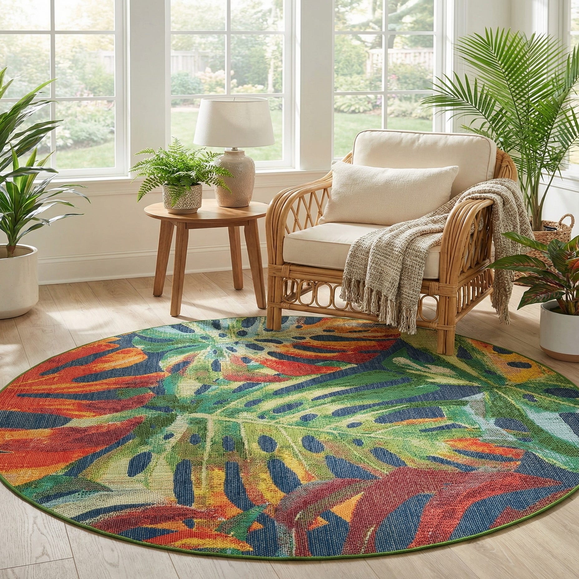A bold, painterly leaf motif fills the round surface, with oversized tropical fronds layered in green, olive, navy blue, blue, red, orange, yellow and ivory across a multi background. The pattern feels energetic but balanced; brushstroke-like color transitions and punched-out leaf details create depth and movement without a raised pile. Under your hand the weave is low-profile and slightly textured — a tightly constructed polypropylene surface that lies flat and presents the design clearly.