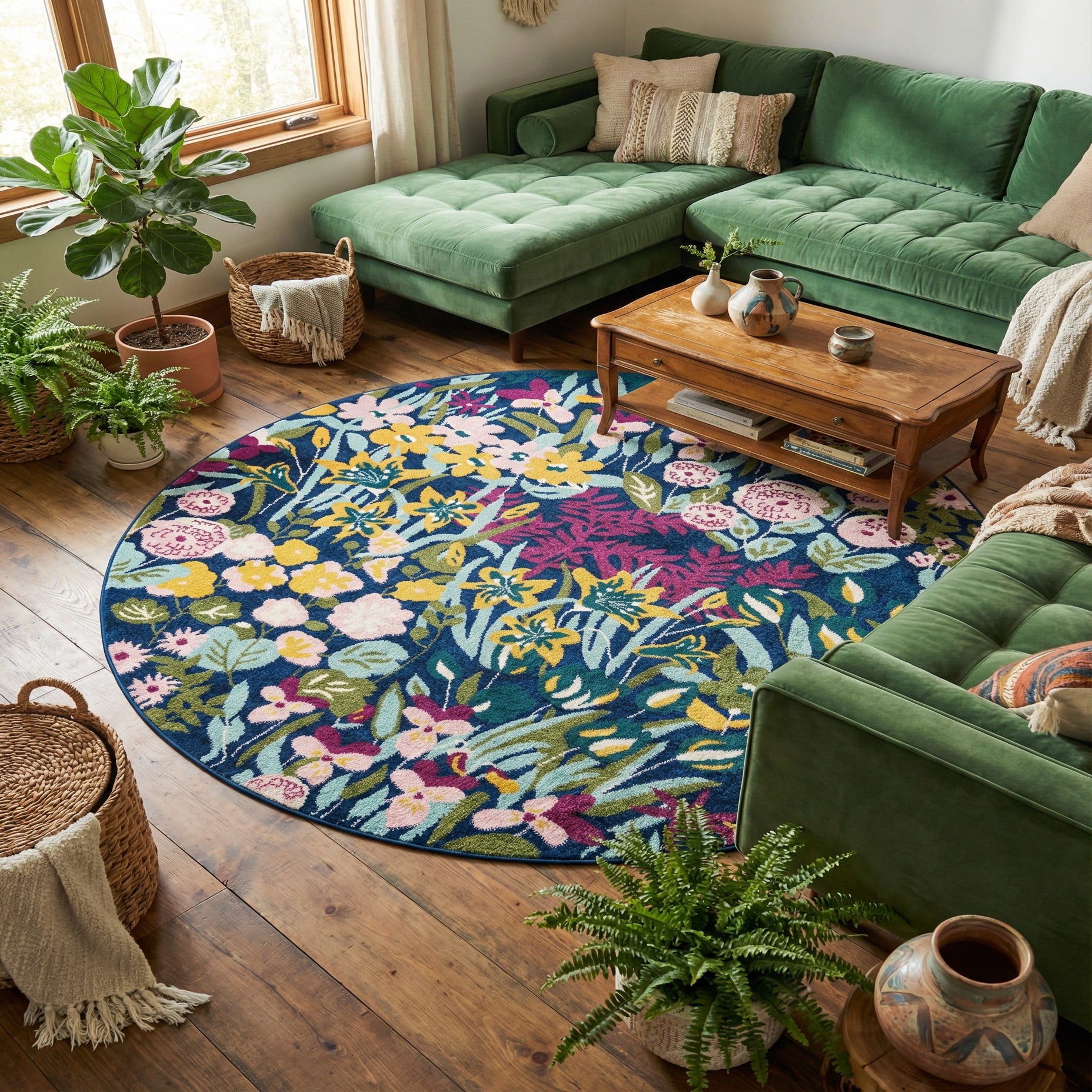 Works well as an anchor under a round dining table or tucked beneath a seating grouping to introduce color and pattern without overwhelming the room. The playful yet composed palette pairs easily with coastal, cottage, bohemian, or eclectic interiors—try it with natural woods and light linens for a breezy look, jewel-toned accents for a richer scheme, or layered over a neutral floor in a sunroom or play area to bring instant warmth and personality.