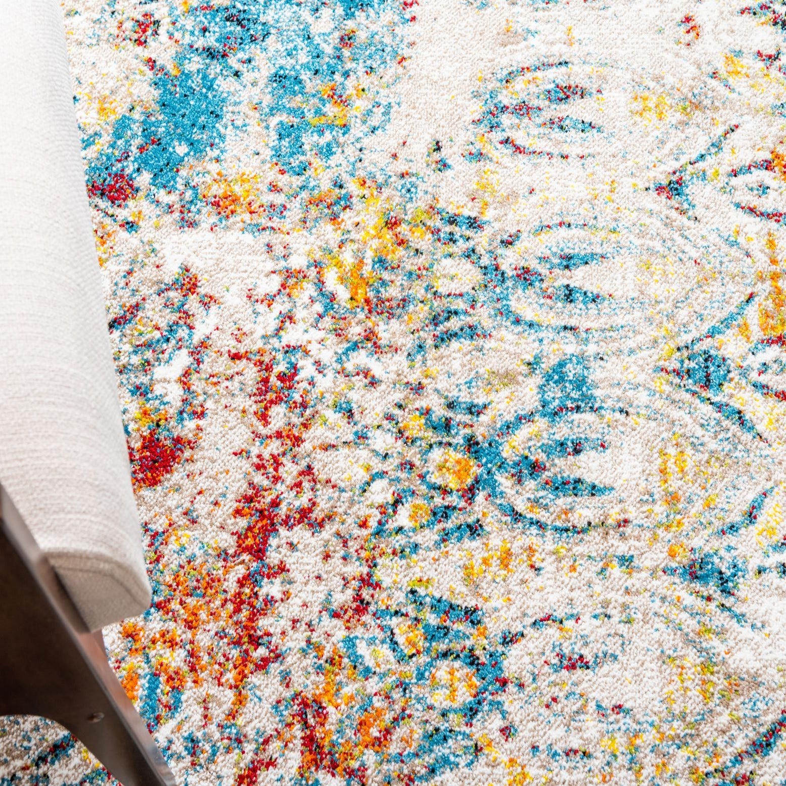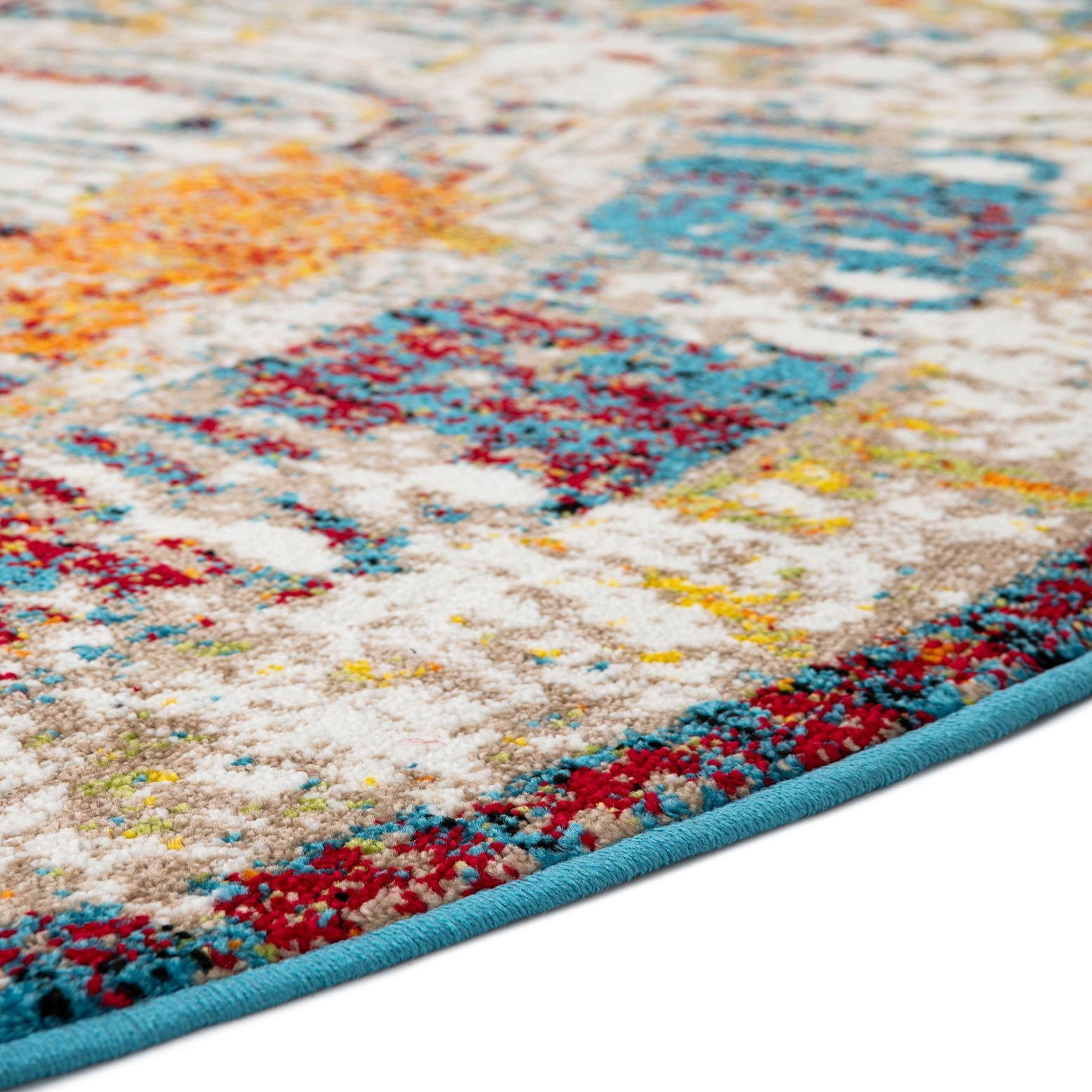 Machine made of 100% polypropylene, the surface has a low, even pile that feels smooth and slightly cushioned underfoot; running your hand across it reveals a consistent, tightly woven texture with subtle variations where the distressed colors overlap. Its bold yet adaptable palette works well beneath a round dining table, as an anchor for a small seating area, or as a colorful layer in an entry or sunroom. Pair it with warm wood tones and neutral upholstery for a transitional look, woven textiles and leather for a bohemian mix, or clean-lined furnishings for a contemporary eclectic vibe.